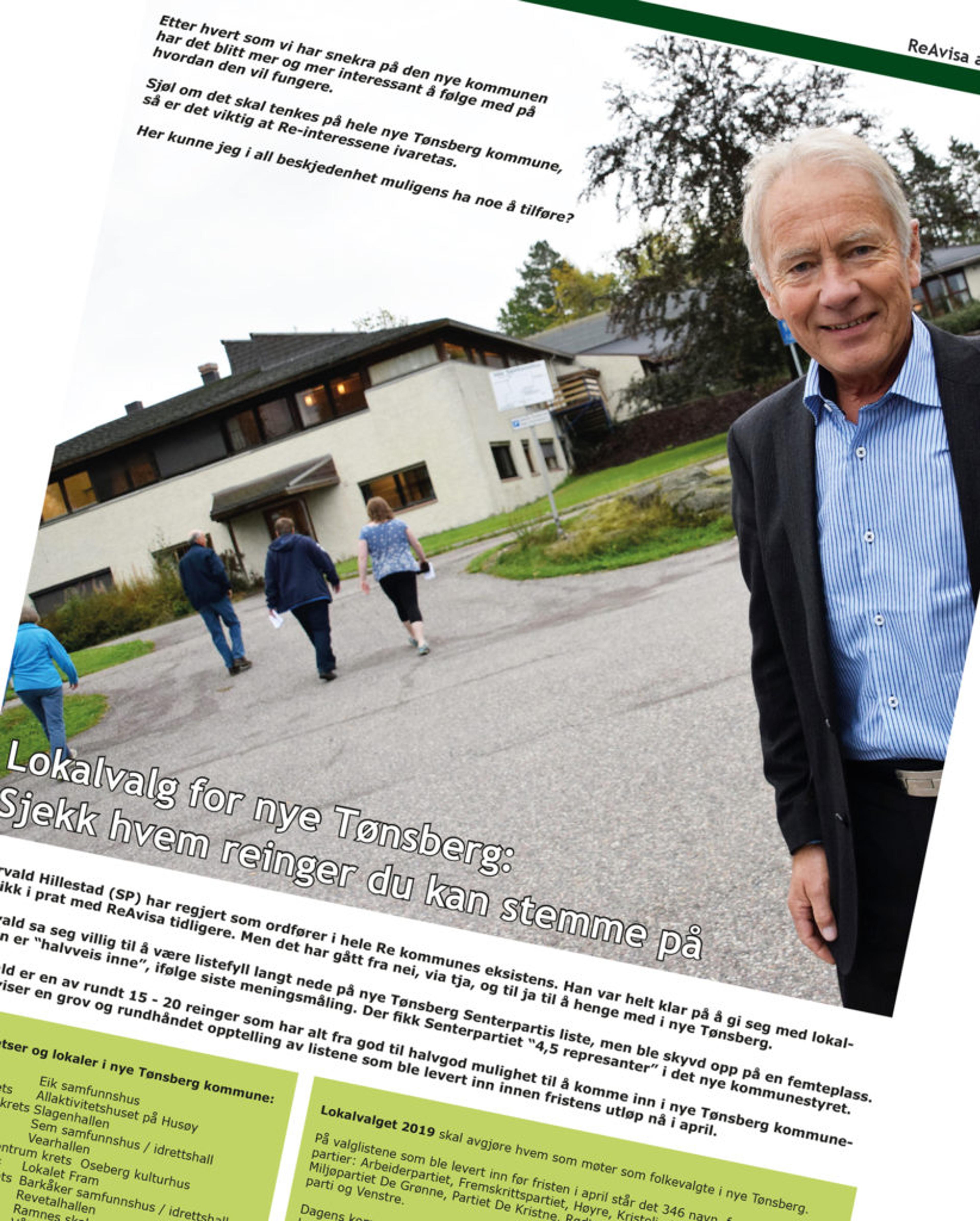 FRA NEI, VIA TJA, TIL JA: Thorvald Hillestad (SP) har regjert som ordfører i hele Re kommunes eksistens. Han var helt klar på å gi seg med lokal-politikk i prat med ReAvisa tidligere. Men det har gått fra nei, via tja, og til ja til å henge med i nye Tønsberg. Faksimile: ReAvisa april 2019.