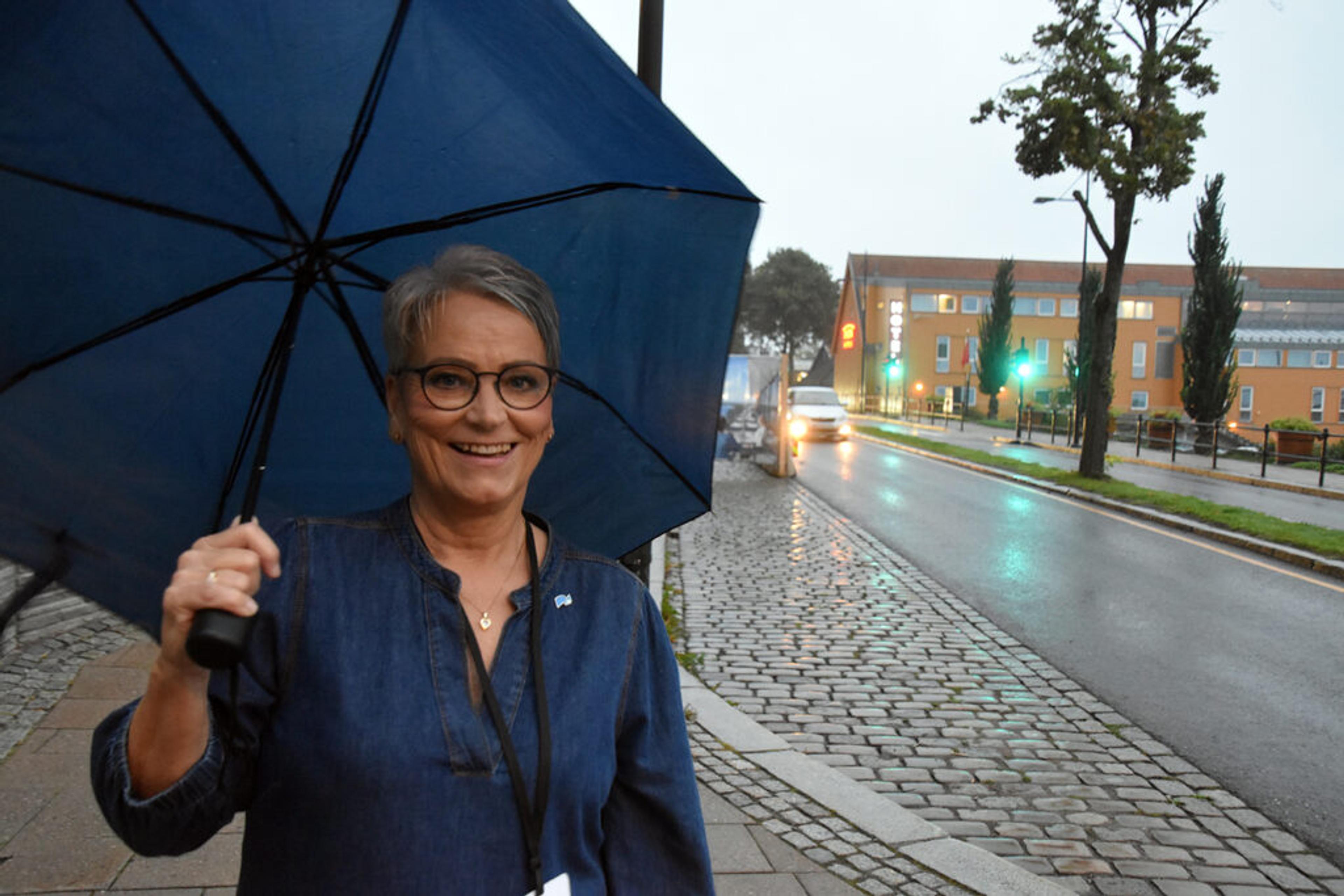 SØKER LY: Det regner og blåser på valgdagskvelden, så Tove Øygarden (H) søker ly under en blå paraply. Men Høyre-vinden tidligere i valgkampen skulle hun ønske hadde holdt seg gående helt fram til siste slutt. Nå er hun spent på oppslutningen og eventuelle posisjoner til seg og sine. Hun står med stemmetillegg fra partiet, og er uansett sikra plass i det nye kommunestyret. Foto: Stian Ormestad, ReAvisa.