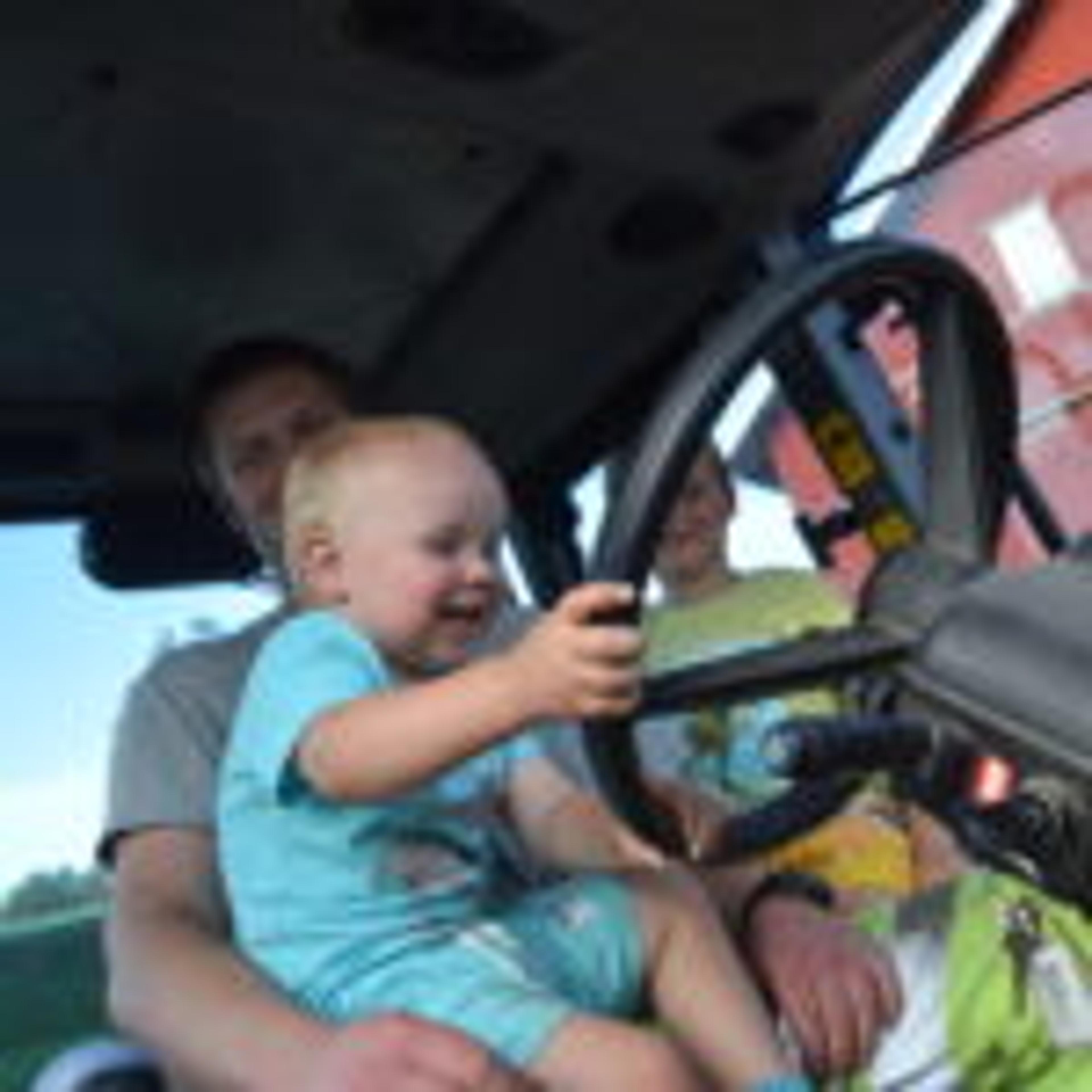 TRAKTORER OVERALT: Ingen tvil i hva det går i for gutta på gården. Små og store traktorer finner vi overalt. Men ekstra stas er det for Henry (2) å få ta i rattet på den største traktoren av dem alle! Foto: Stian Ormestad.