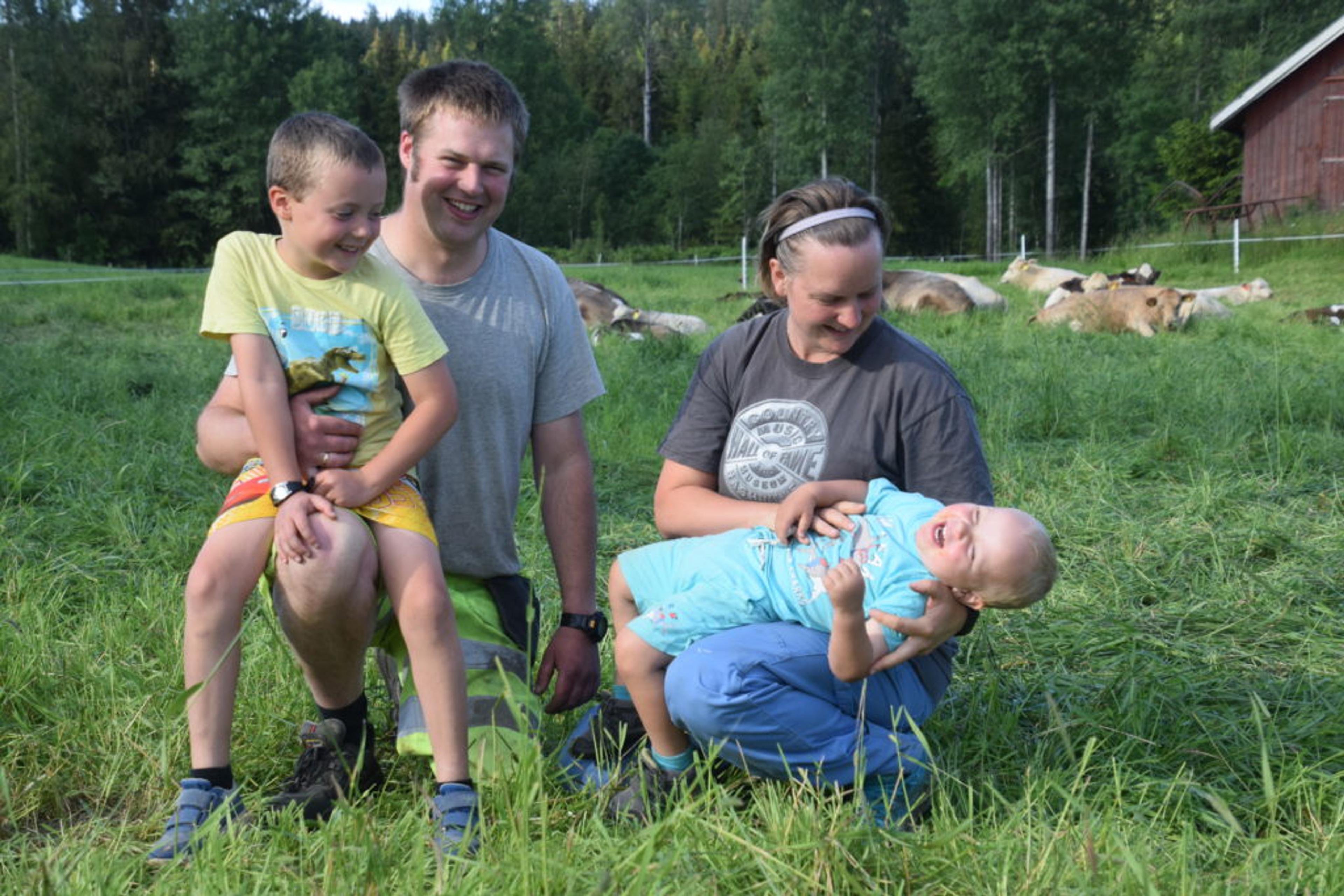 VALLUMRØD GÅRD: Vertskapet ved Erlend Bjørnevoll (37) og Anne-Lise Bu (35), sammen med barna Viljar (5) og Henry (2). Foto: Stian Ormestad.