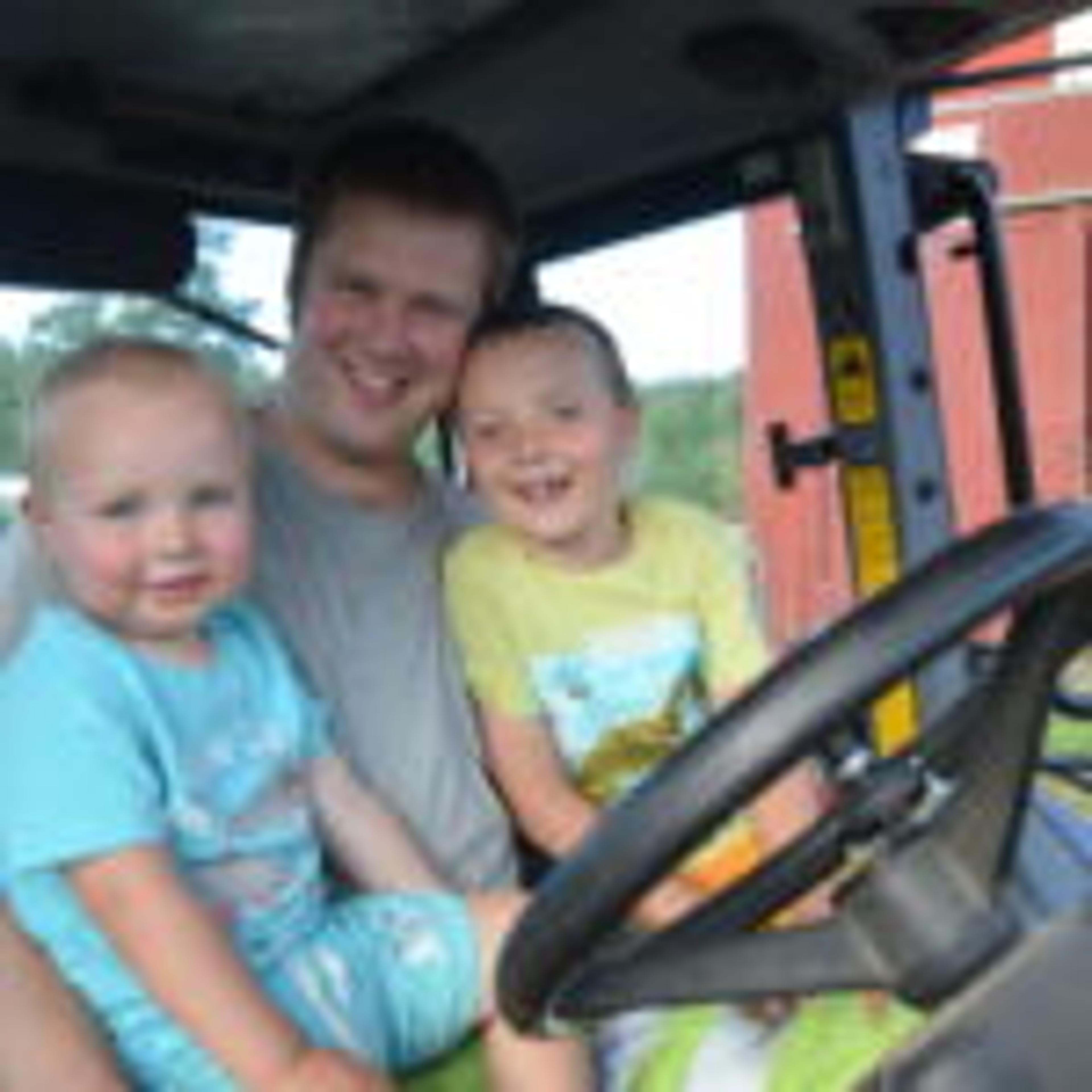 HELE FAMILIEN TRÅR TE: Det er stas å være med pappa i traktoren! Foto: Stian Ormestad.