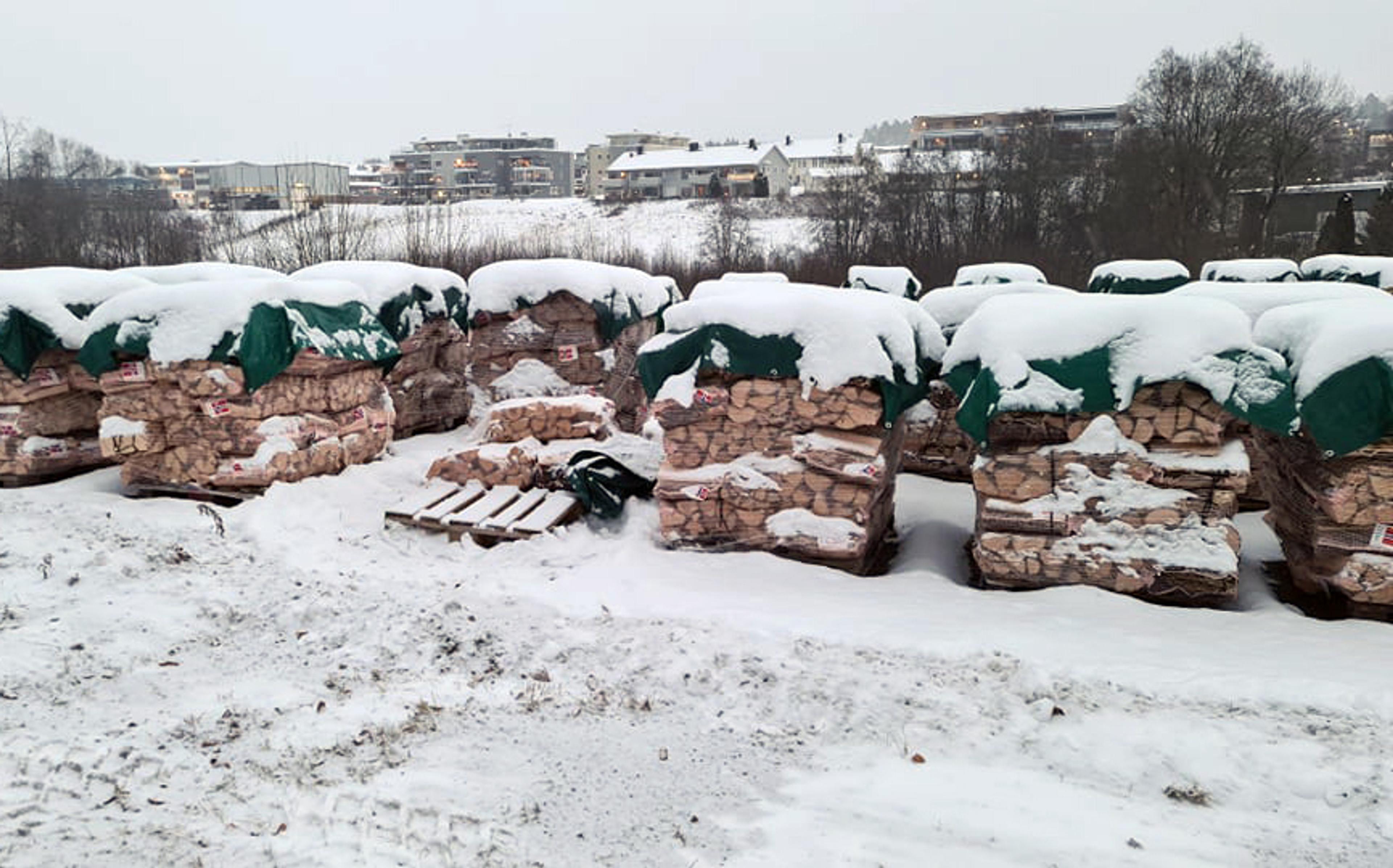 VEDLAGER: Denne veden er salgsklar først før neste vinter. Men en vedtjuv har stikki av med 27 sekker av ved på lager utafor Olgars på Brår. Foto: Privat.