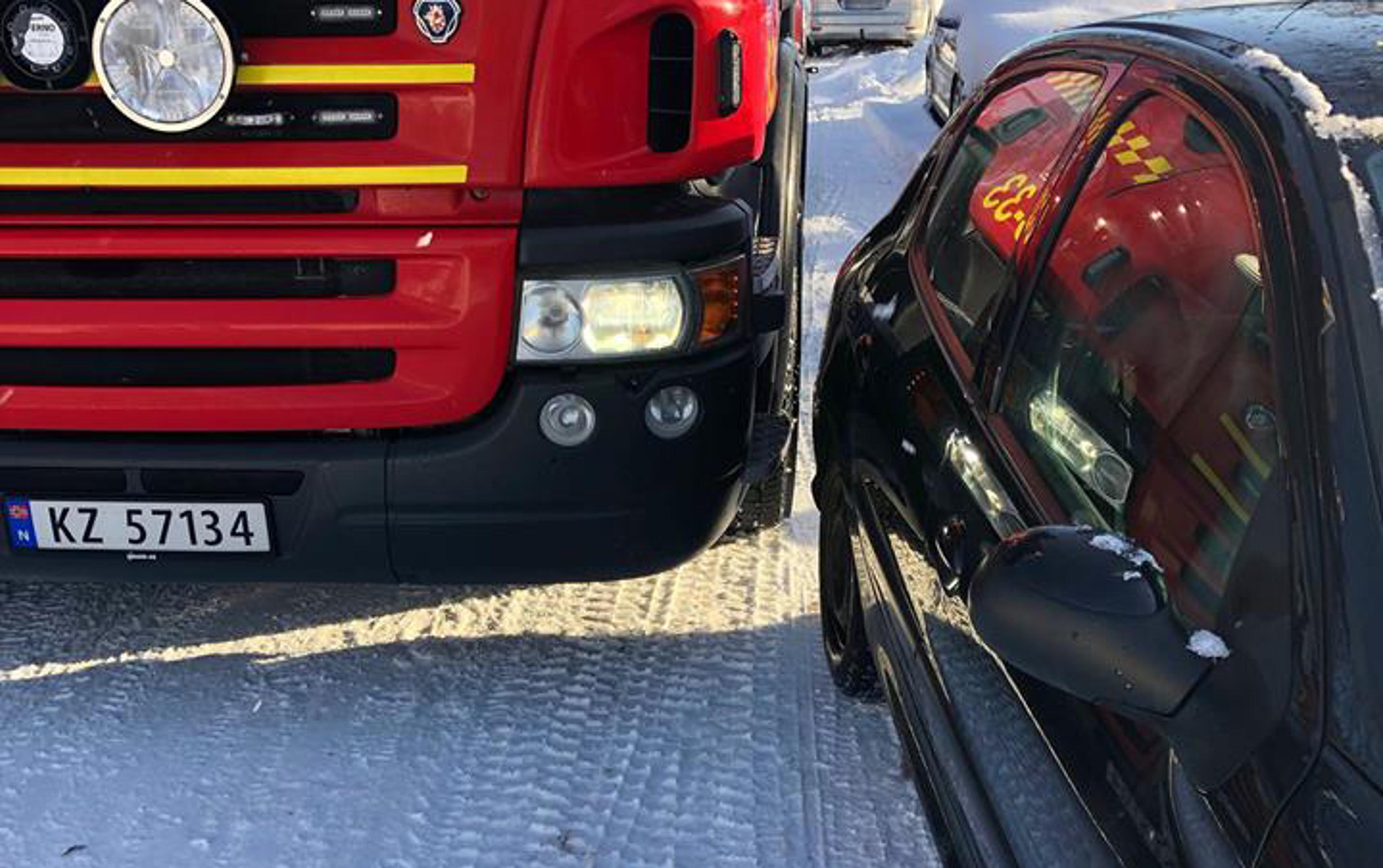 TEST: Vestfold interkommunale brannvesenet testa tidligere i vinter framkommeligheten rundt om i sitt distrikt: – Dette er ikke OK. Her kom vi fram med millimetere klarning. Veibredden for våre kjøretøy må være minimum er 3,5 meter. Foto: VIB.
