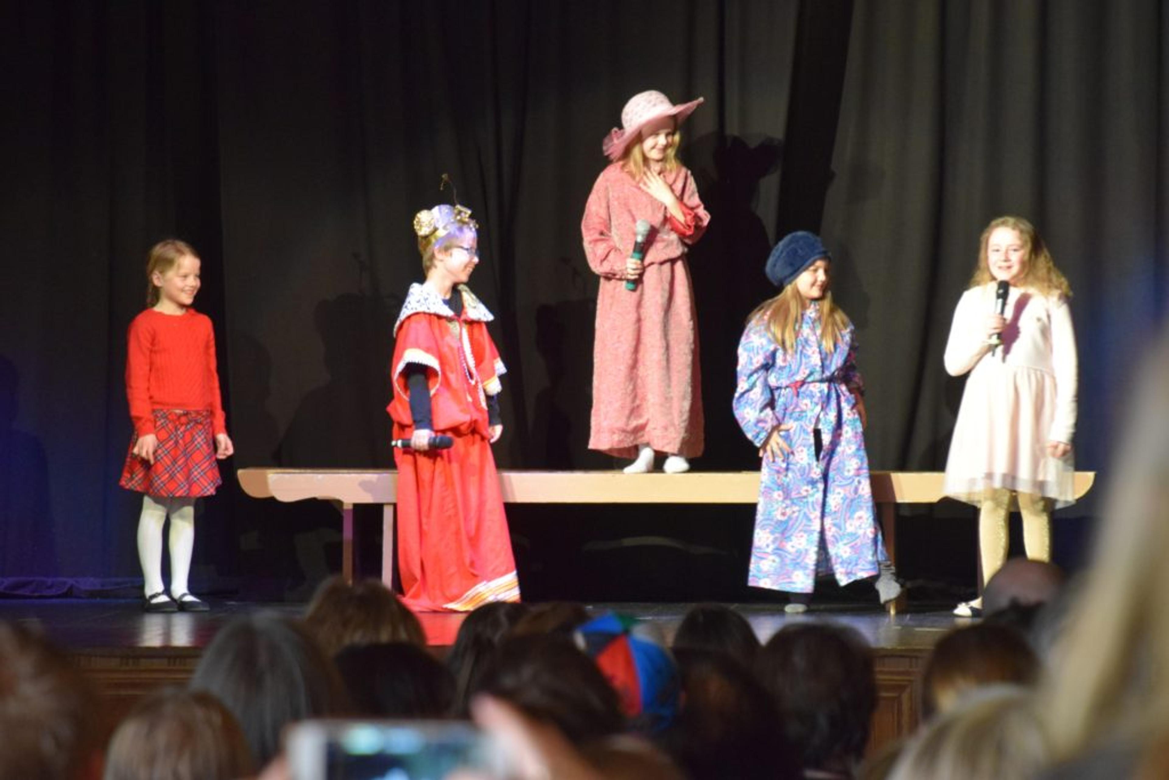 HØY I HATTEN: Sprell, tull og tøys på Dalheim-scenen da Solerød skole markerte at det er 100 år siden Andre Bjerke ble født i år. Foto: Stian Ormestad.