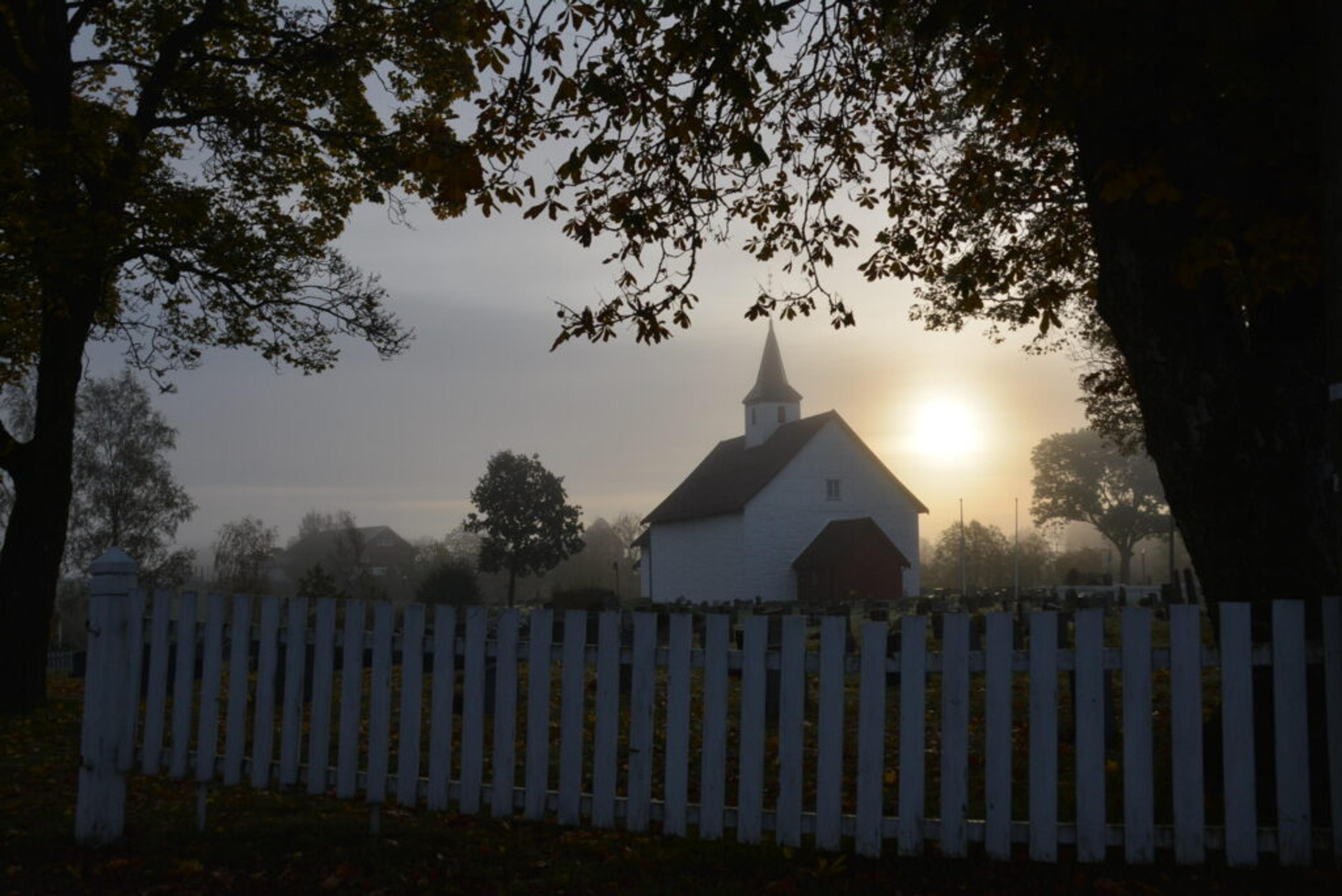JUL I RE-KIRKENE: Også denne jula blir prega av korona-restriksjoner. Maks tjue inne i kirka av gangen, gjør at sogneprestene må være kreative og tenke alternativt – igjen. Bildet viser Ramnes kirke i et flott vinterlys. Foto: Stian Ormestad.