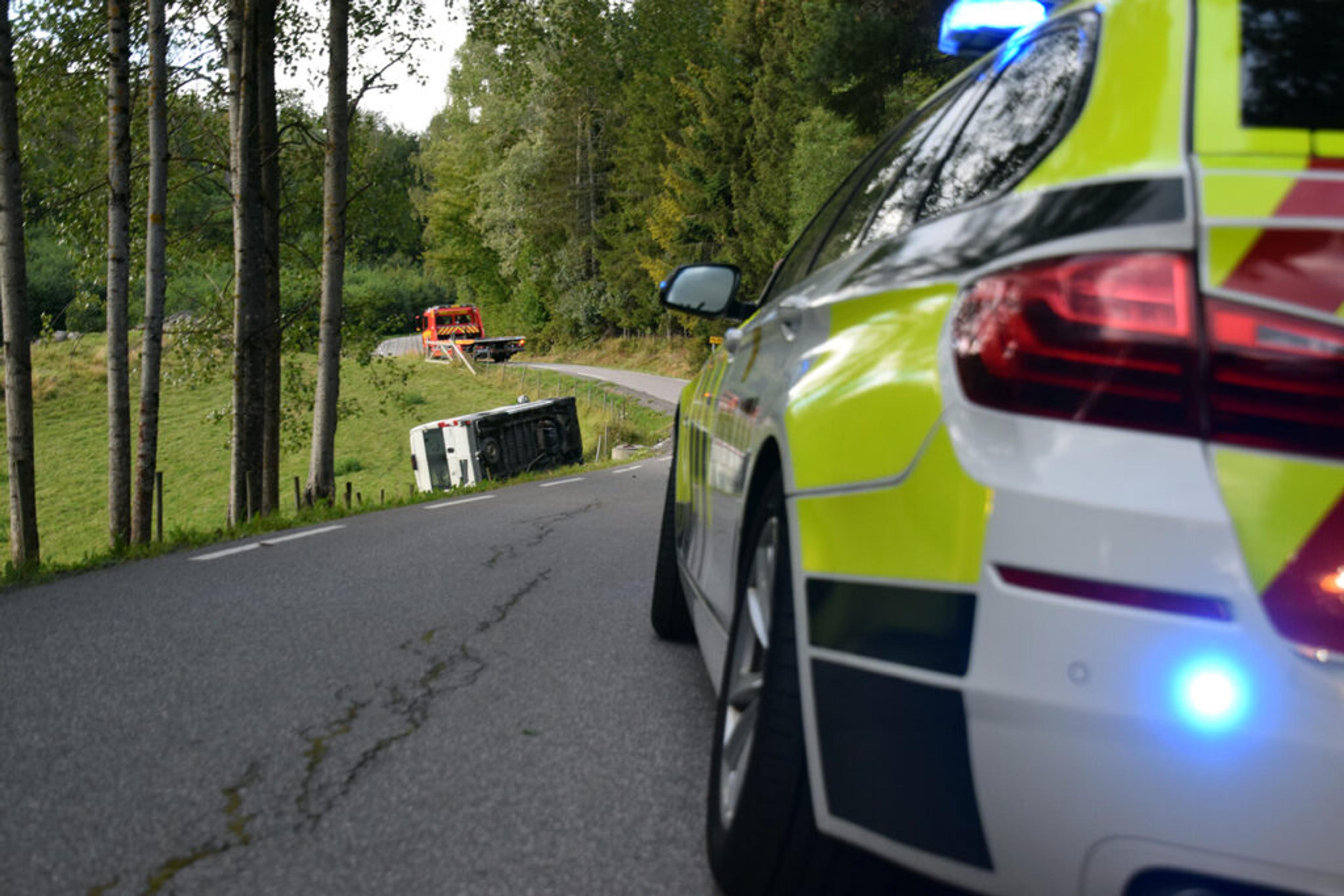 Trafikken passerer ulykkesstedet i skrivende stund, men veien kan blir helt stengt en kort periode under berging av varebilen.