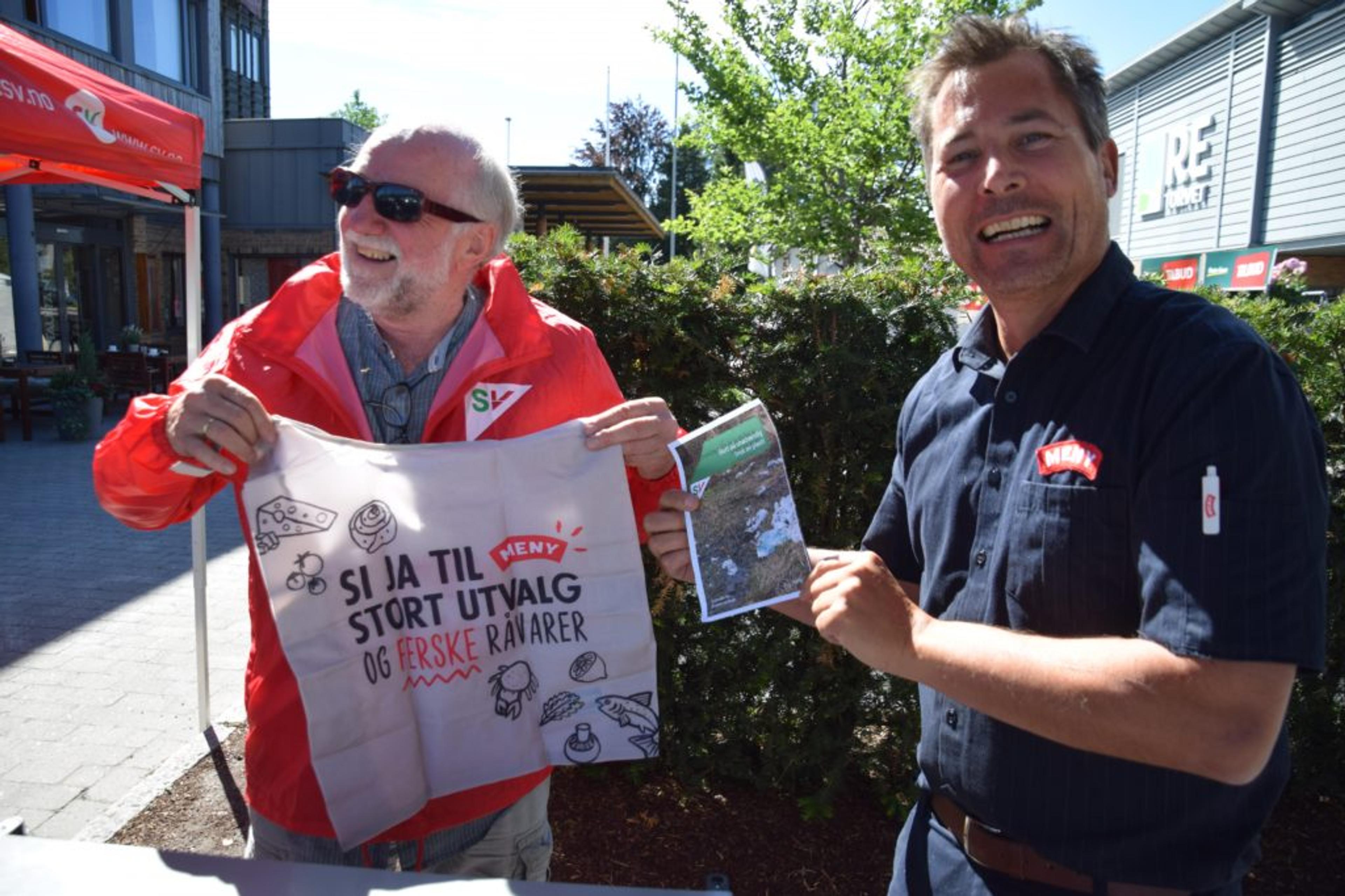 Og på Verdens miljødag fikk Martin hjelp av SV-standen på Re-torvet til å dele ut handlenett. Det ble ingen stor diskusjon rundt plastproblematikken. Der er SV-er Heming Olaussen og kjøpmann Martin Gran helt på bølgelengde.