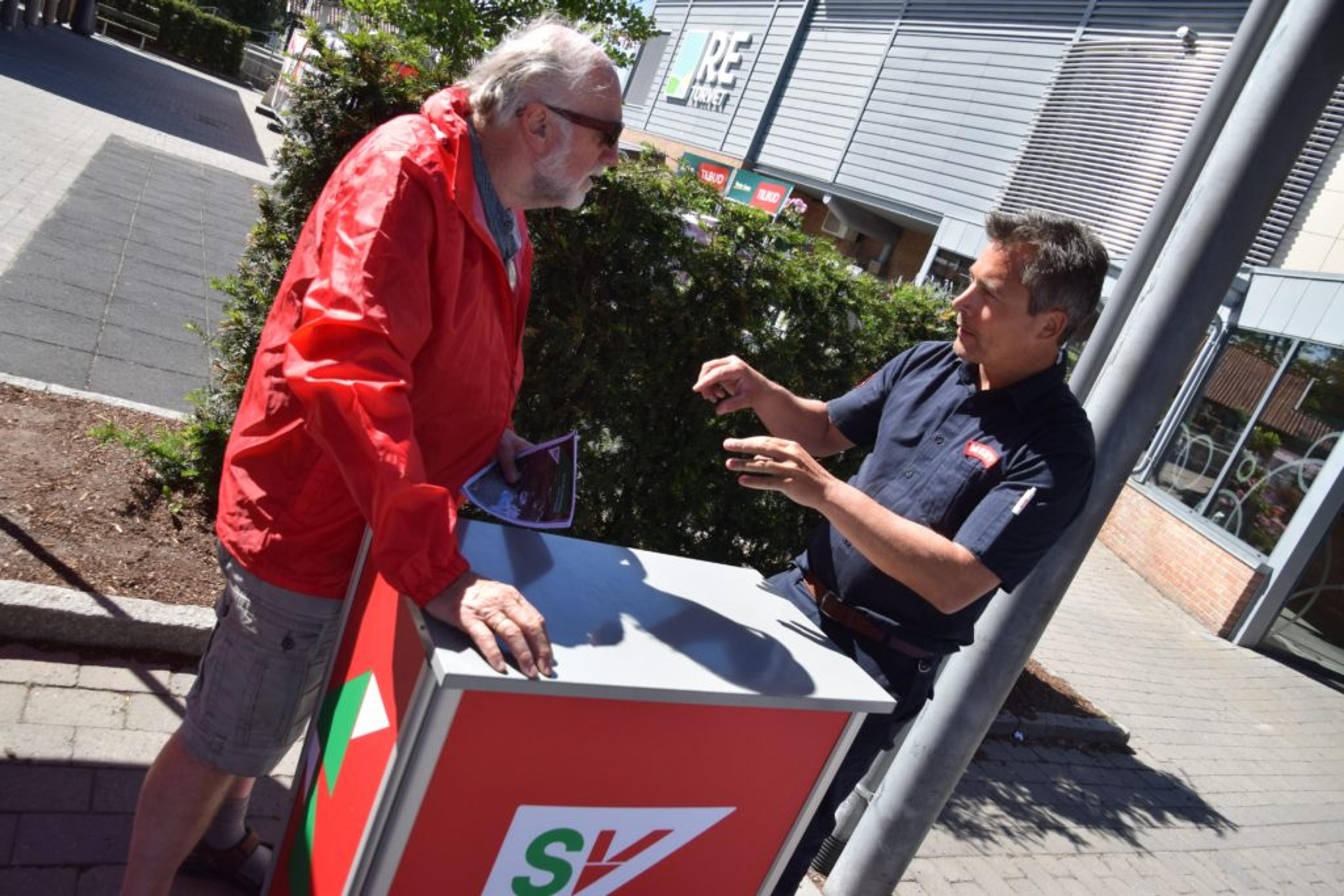 ROLLEBYTTE: SV-er Heming Olaussen promoterer den lokale kjøpmannen, som på sin side deler bekymringen for plastproblemet i verden – med SVs logo på. Foto: Stian Ormestad.