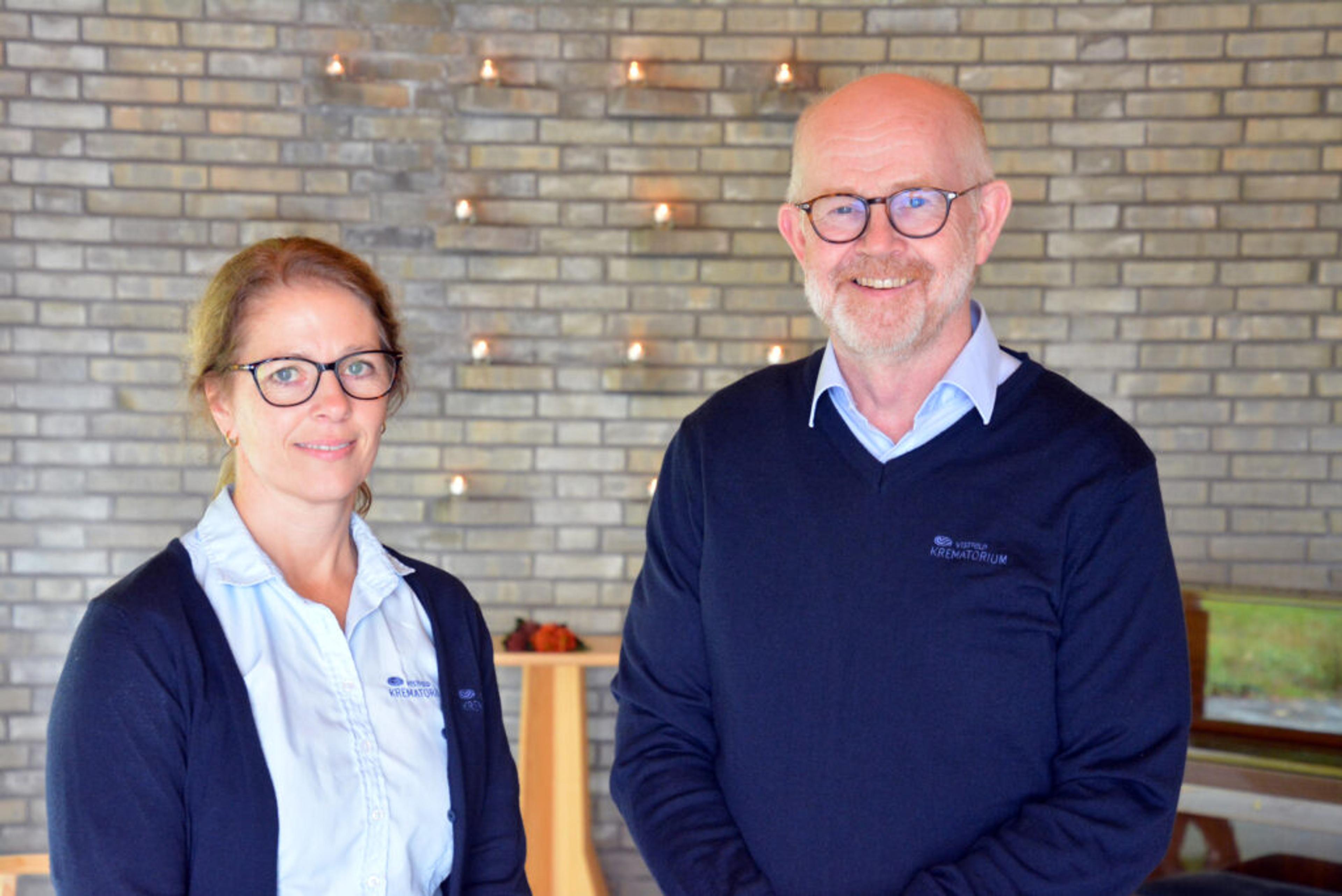 LEGGER TILRETTE FOR EN FIN AVSKJED: Ola Asp, daglig leder, og Monika Holm Svinsholt, fagansvarlig, er halvparten av arbeidsstokken på totalt fire ved Vestfold Krematorium IKS på Fevang. Foto: Stian Ormestad.