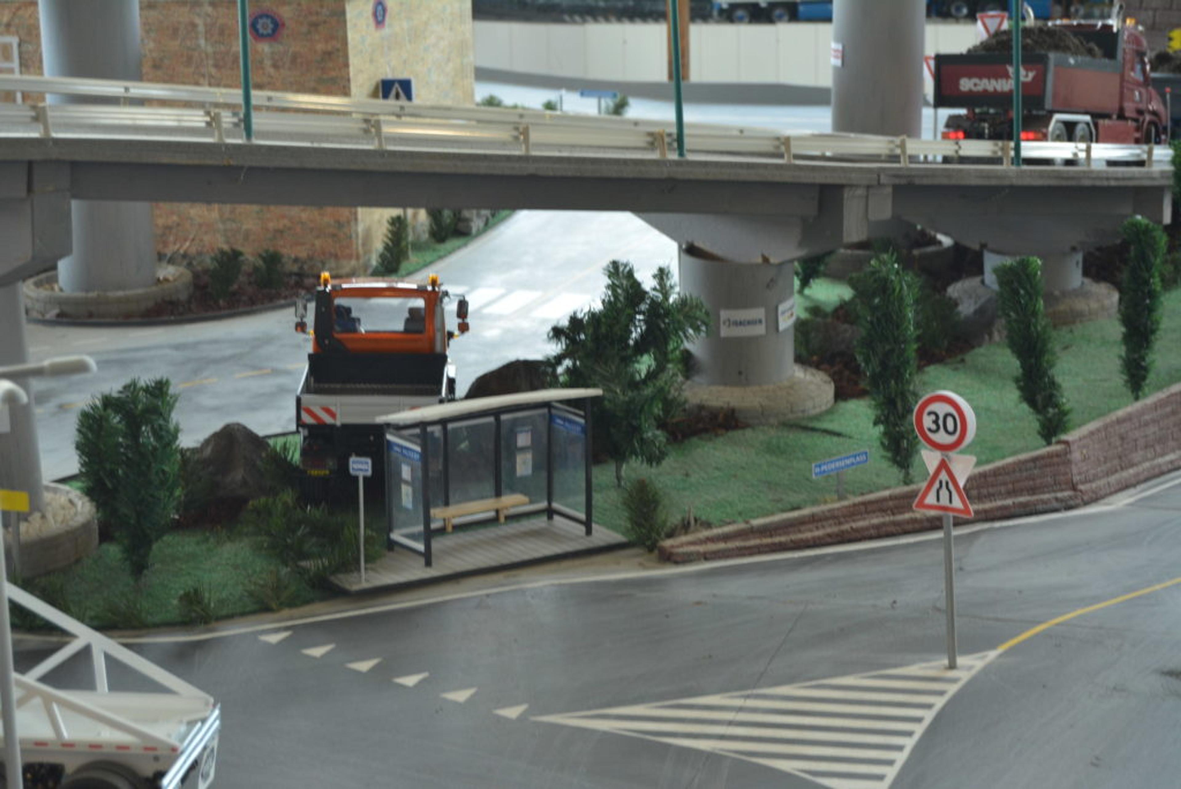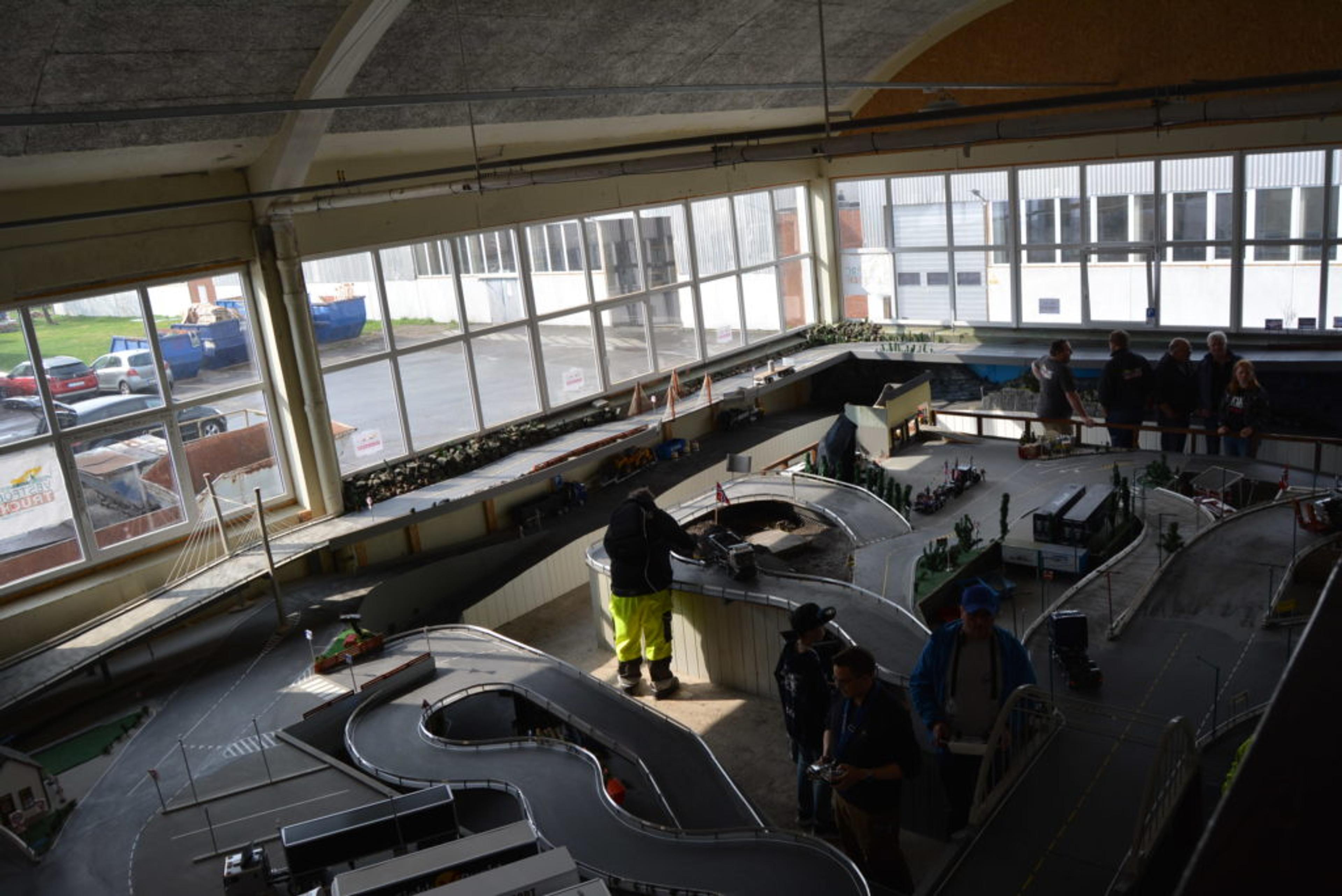 Veiene, skiltene, lastebilene, konsertscenen – alt er skalert ned til fjorten ganger så lite som det er i virkeligheten. Og her kjører medlemmene i klubben radiostyrte lastebiler en til to ganger i uka.