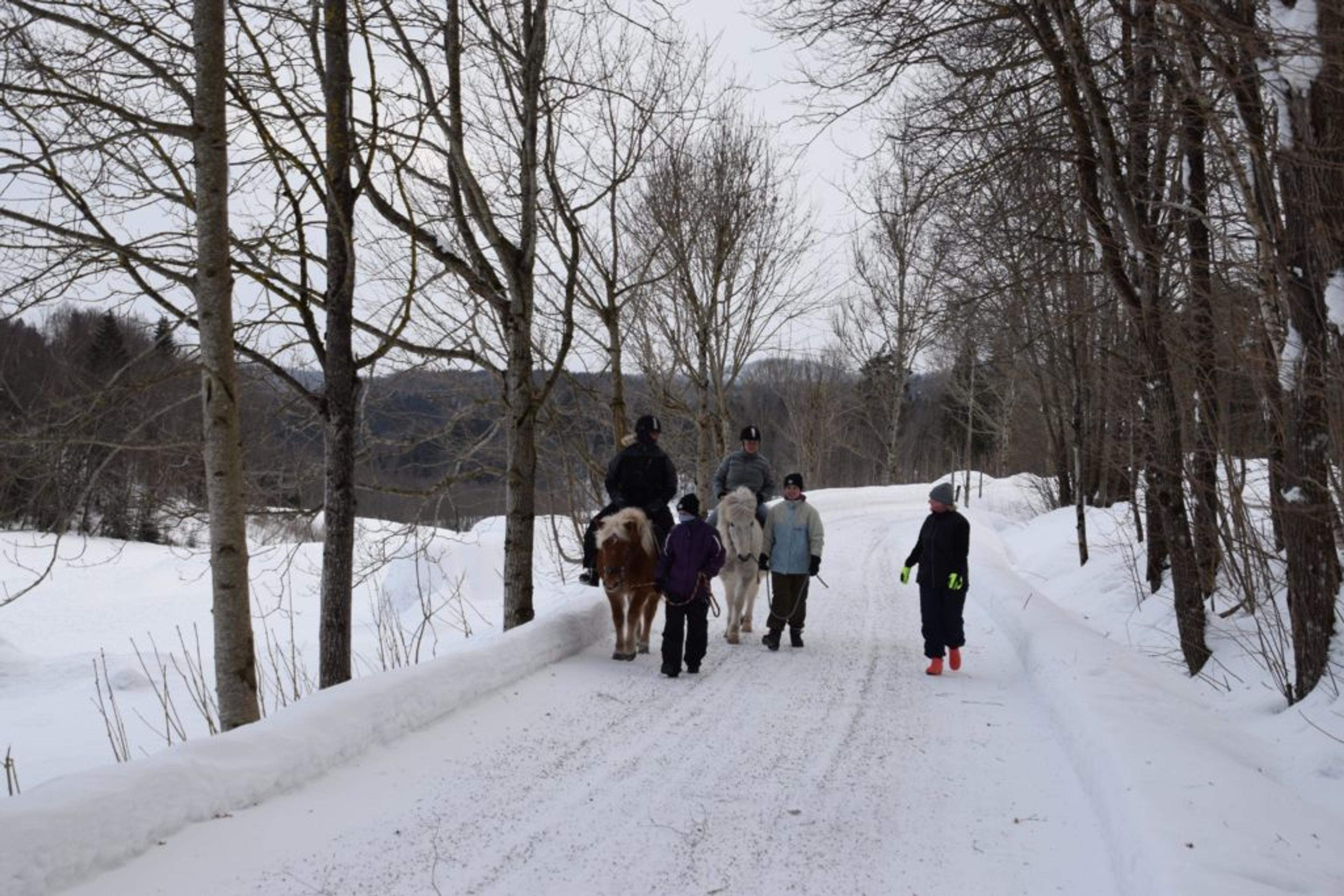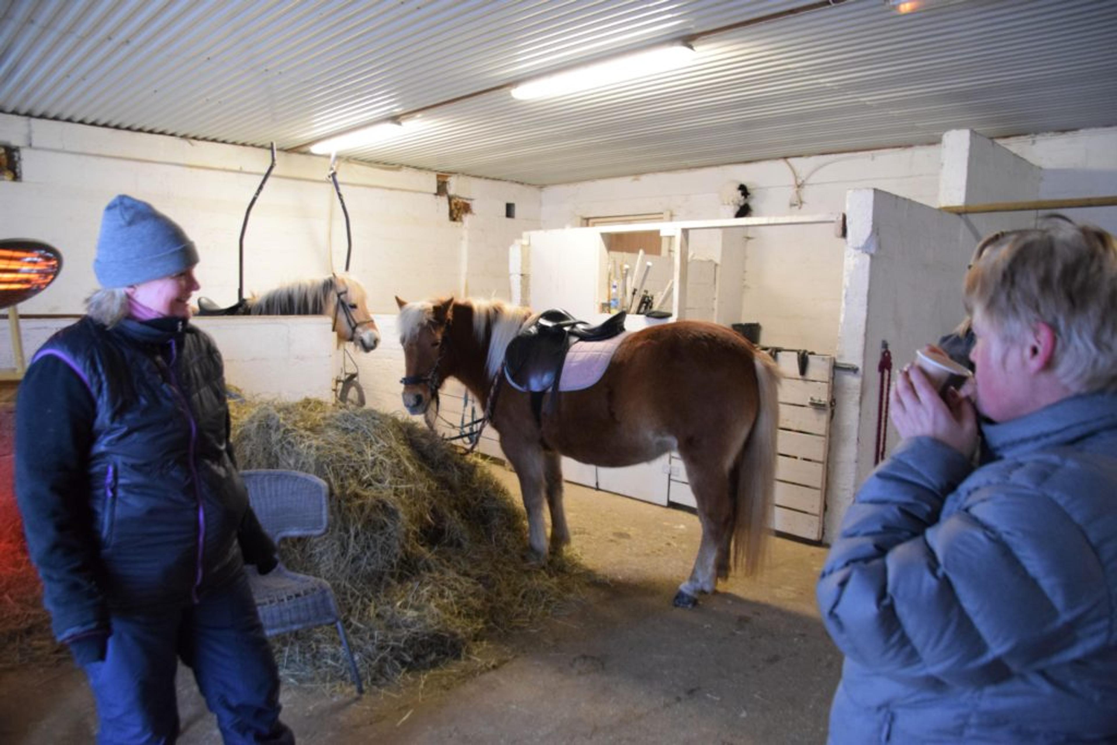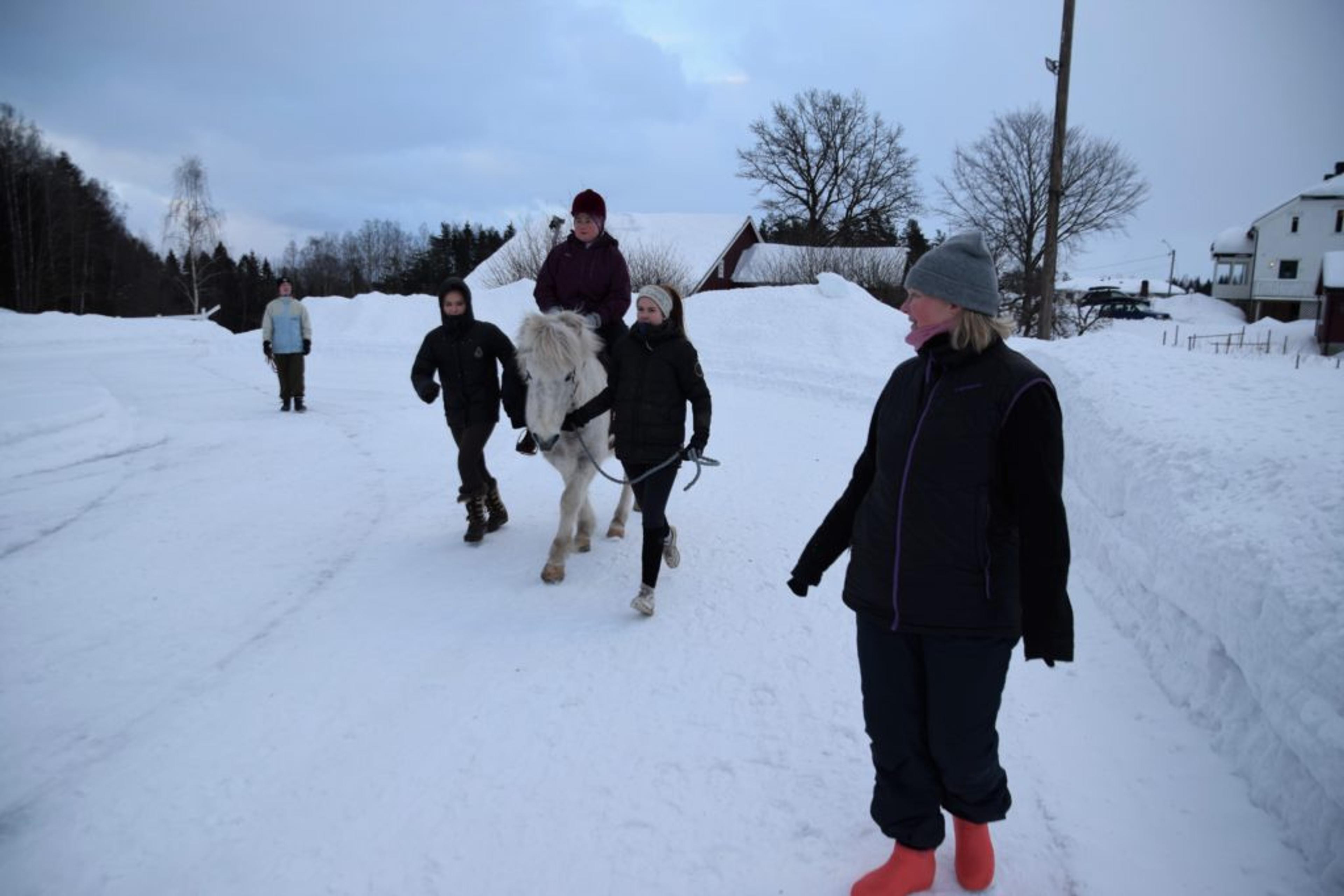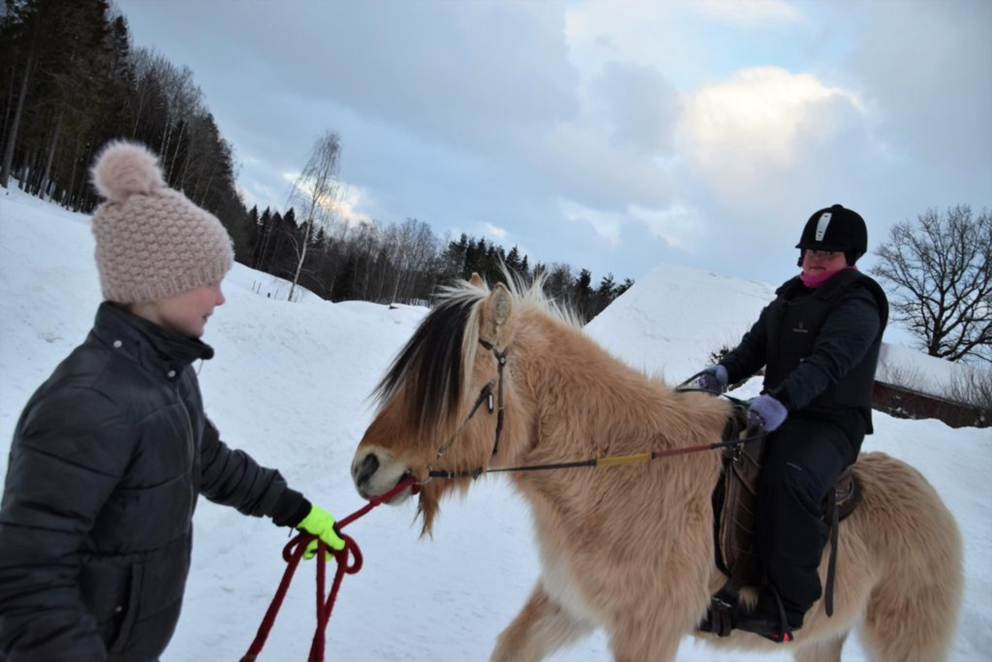ReAvisa har lagt besøket til gården på en av de kaldeste vinterdagene med masse snø, så nå går turen langs gårdsveien og rundt ridebanen. I kulda har både ansatte og pasienter kledd på seg godt, med skjerf godt knyti rundt ansiktet. Men tøffingene lar seg ikke stoppe av vinterværet – verken to- eller firbeinte.