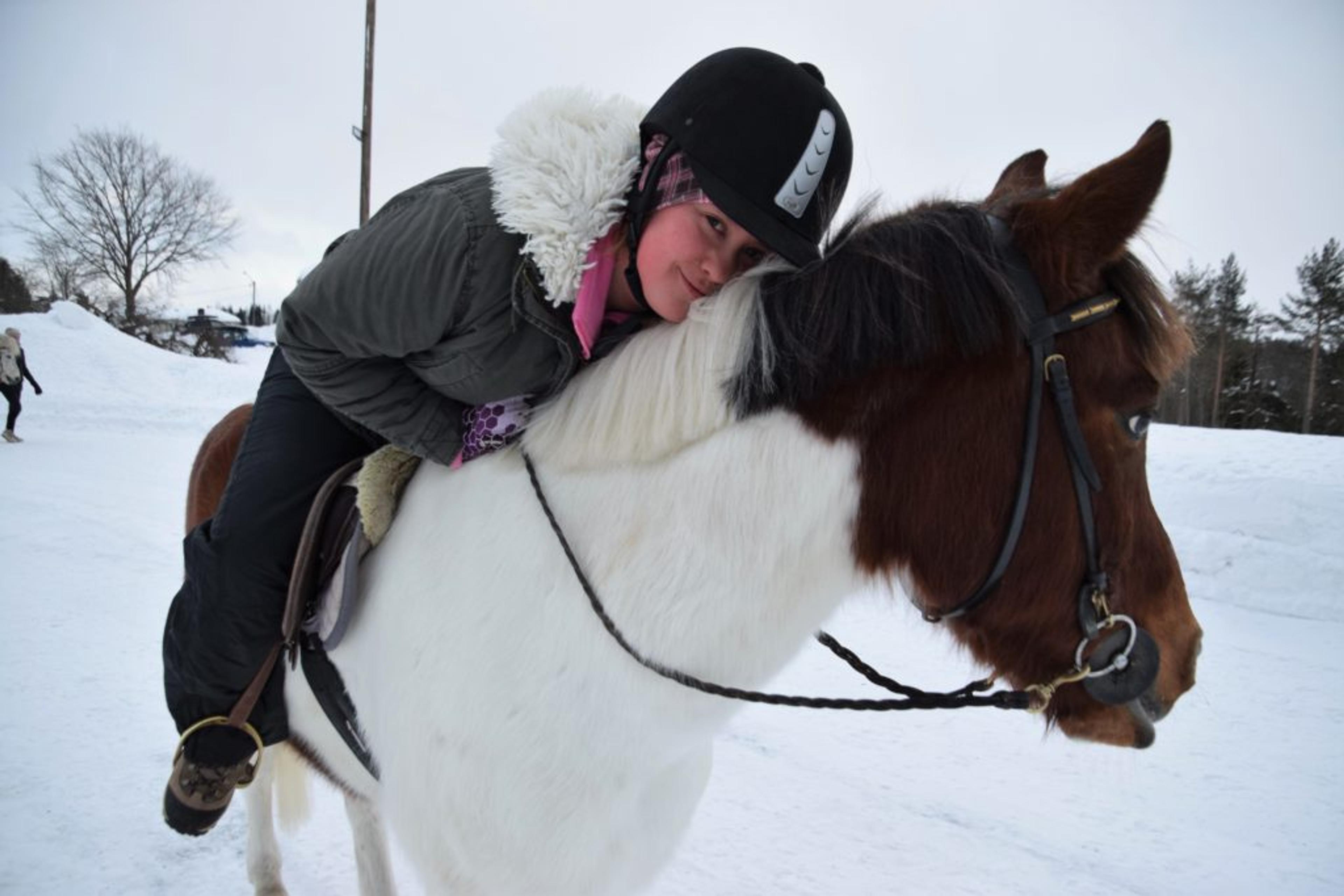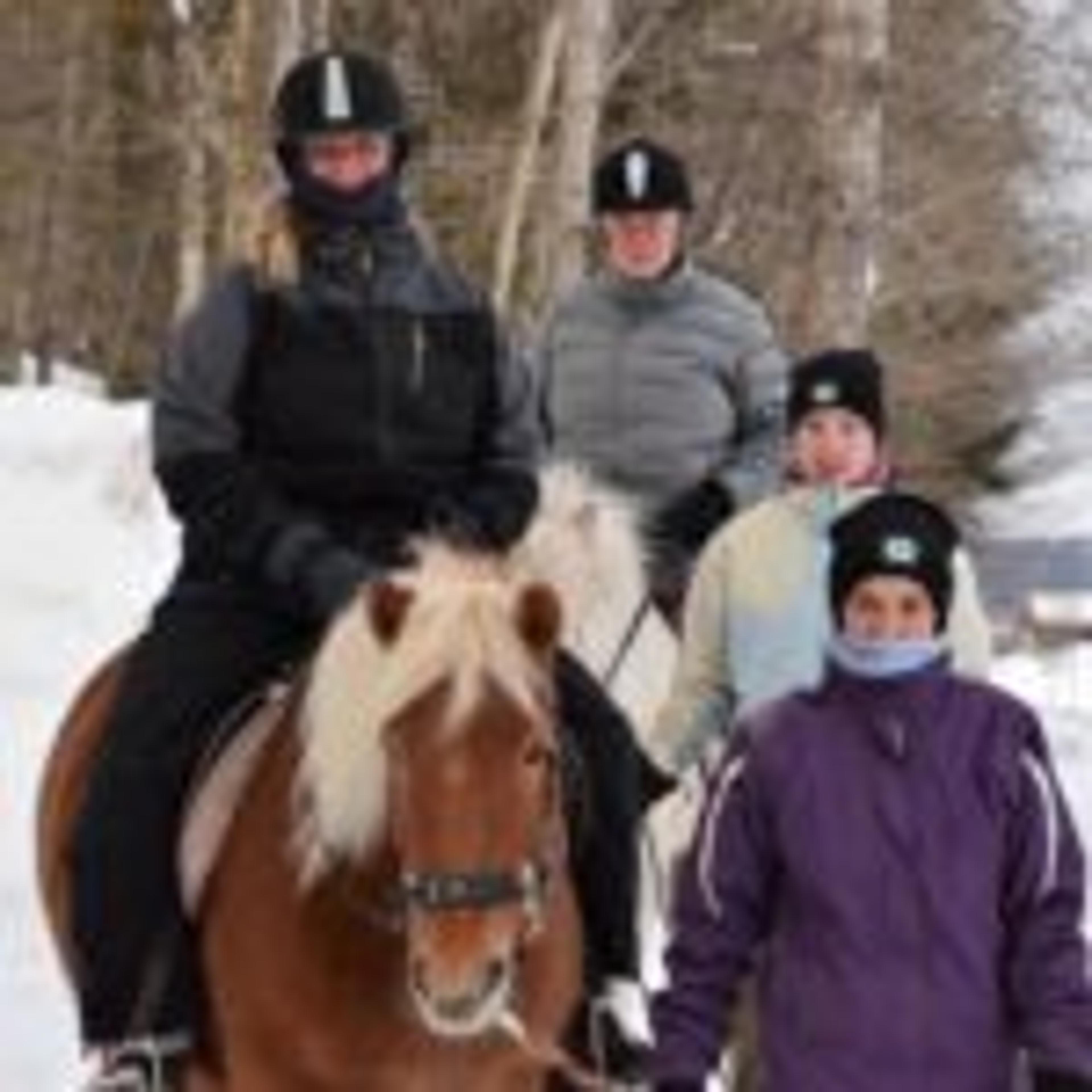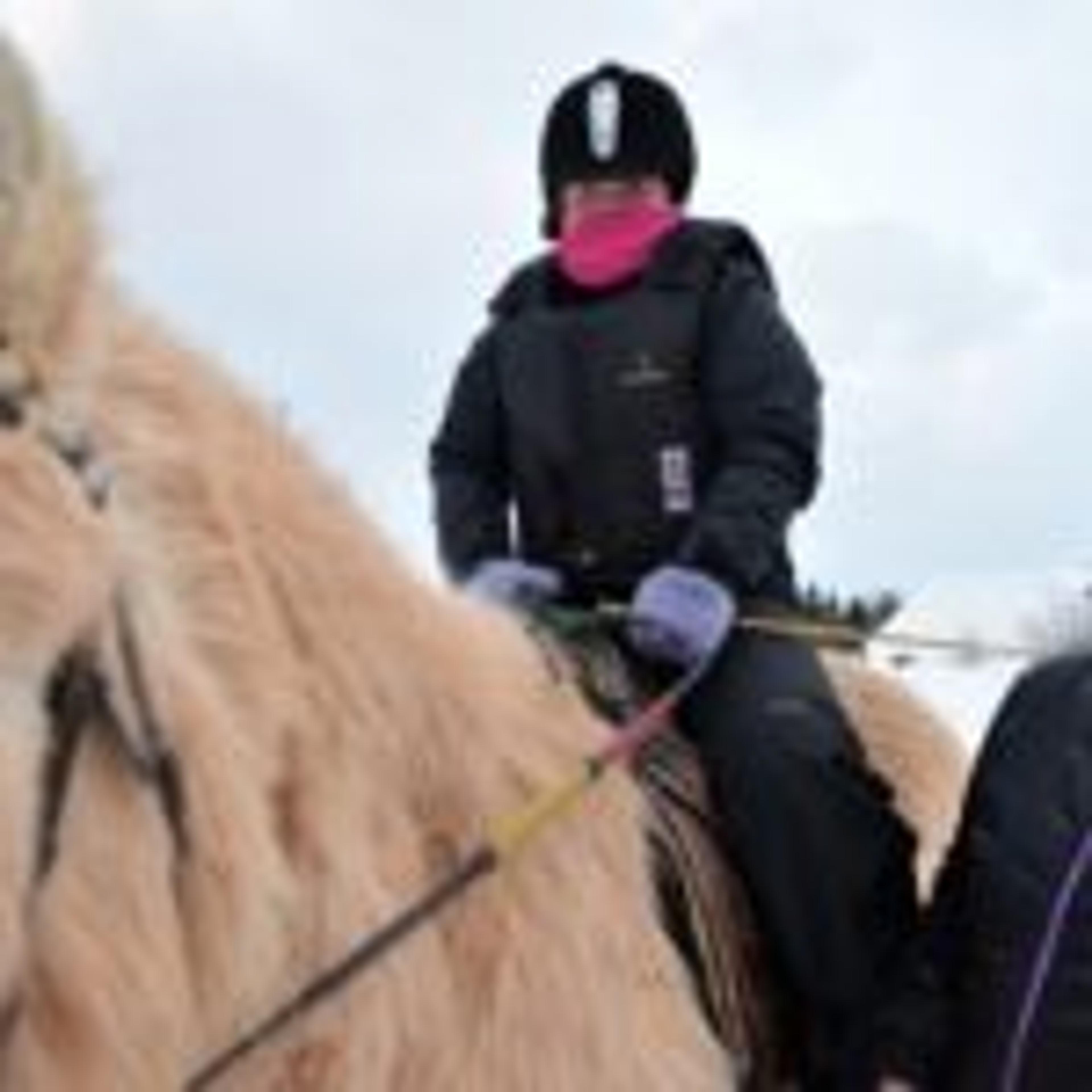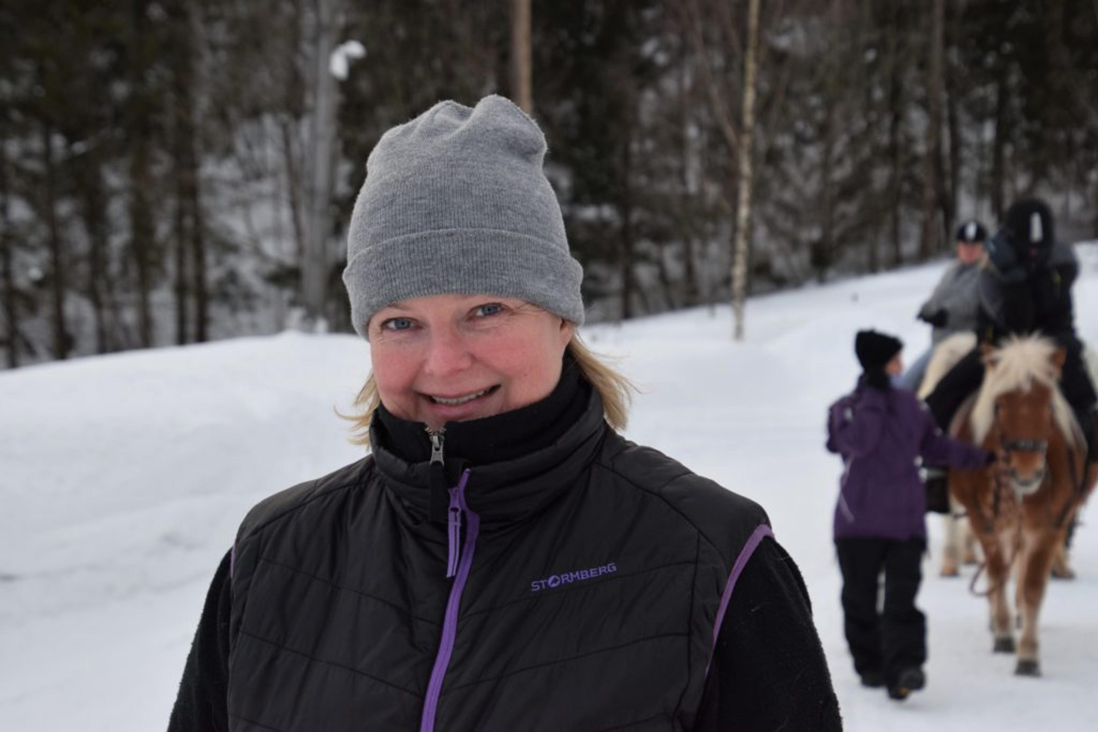 ReAvisa har lagt besøket til gården på en av de kaldeste vinterdagene med masse snø, så nå går turen langs gårdsveien og rundt ridebanen. I kulda har både ansatte og pasienter kledd på seg godt, med skjerf godt knyti rundt ansiktet. Men tøffingene lar seg ikke stoppe av vinterværet – verken to- eller firbeinte.