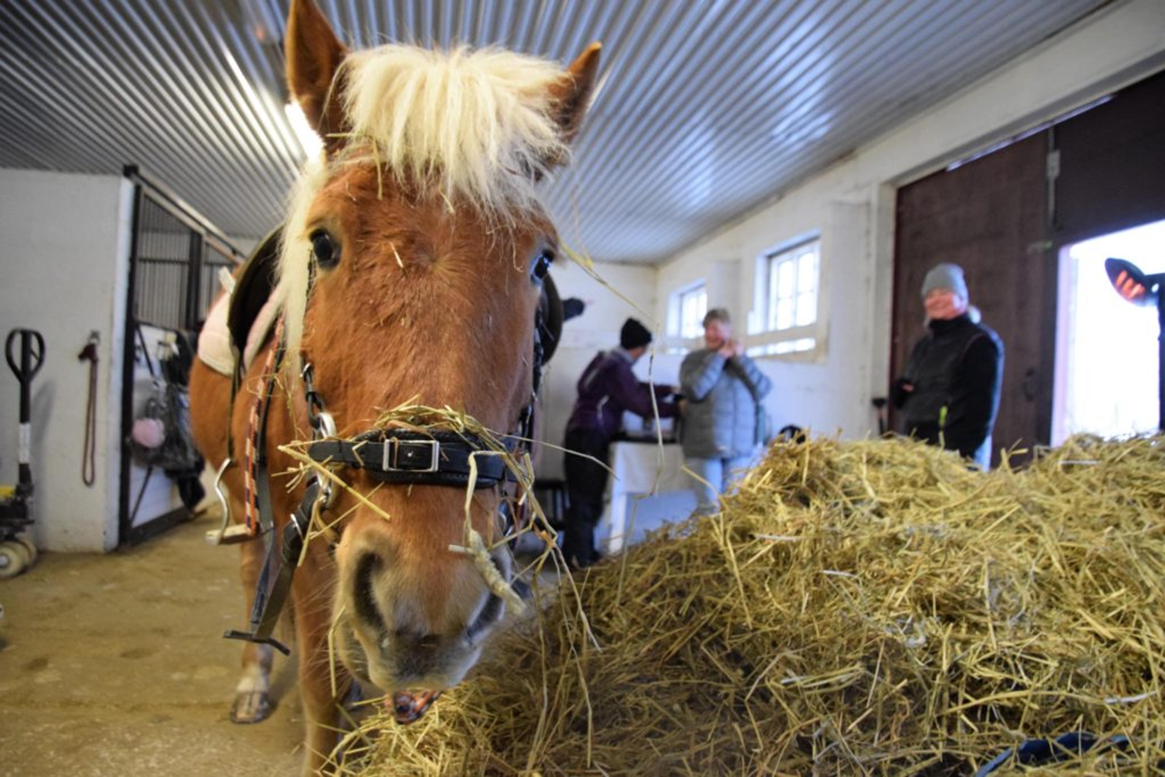 ÅRETS FJORDING: 31 år gamle Linus Monar er en av de mest populære hestene på Opprand gård. Her får han seg en velfortjent matbit mellom treningspassene. I sine yngre dager ble den flotte karen kåra til Årets fjording. Foto: Stian Ormestad.