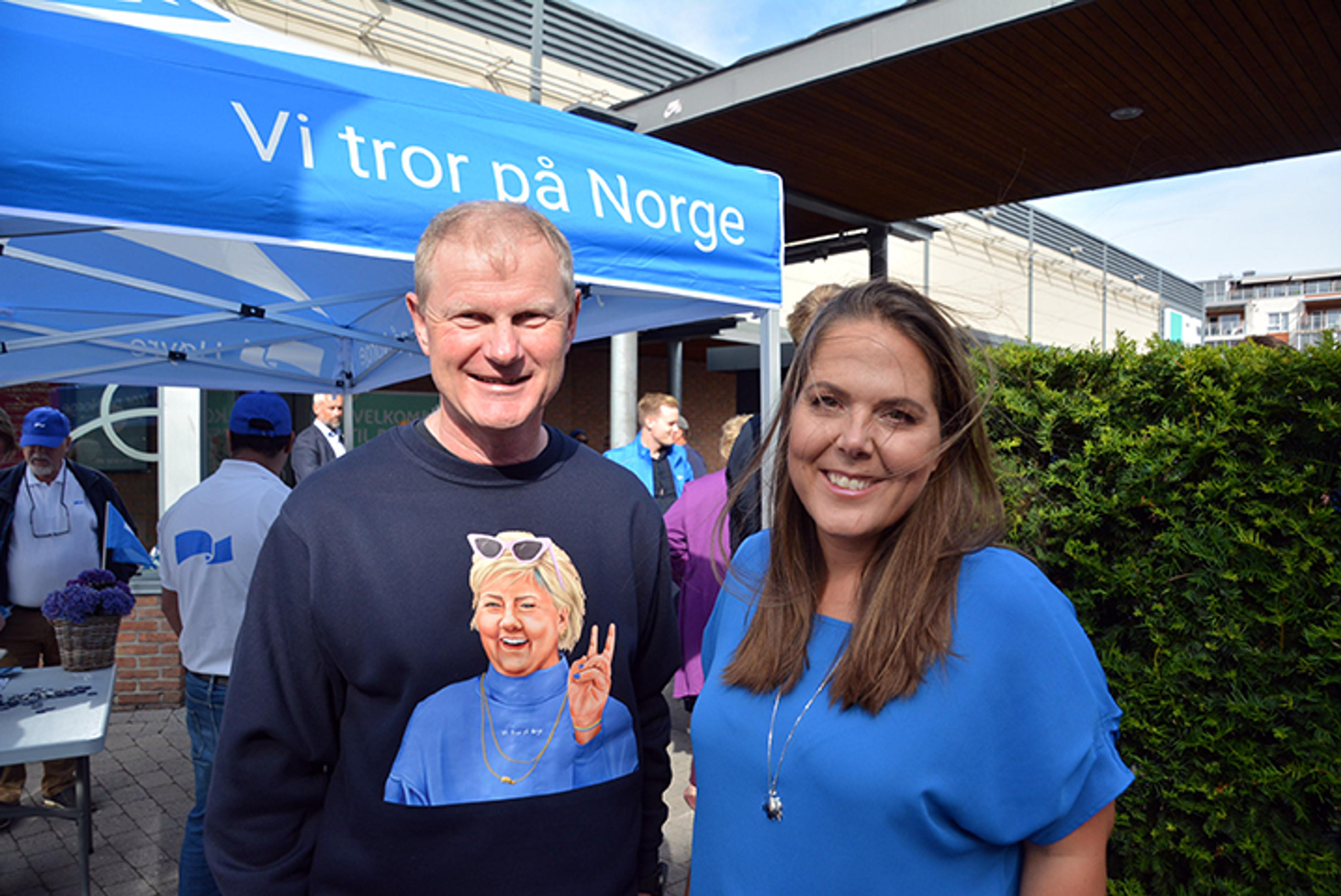 FRA TRE TIL TO: Høyre går tilbake fra tre til to seter fra Vestfold, de går til Erlend Larsen og Lene Westgaard-Halle, her på stand på Revetal i valgkampen. Foto: Stian Ormestad.