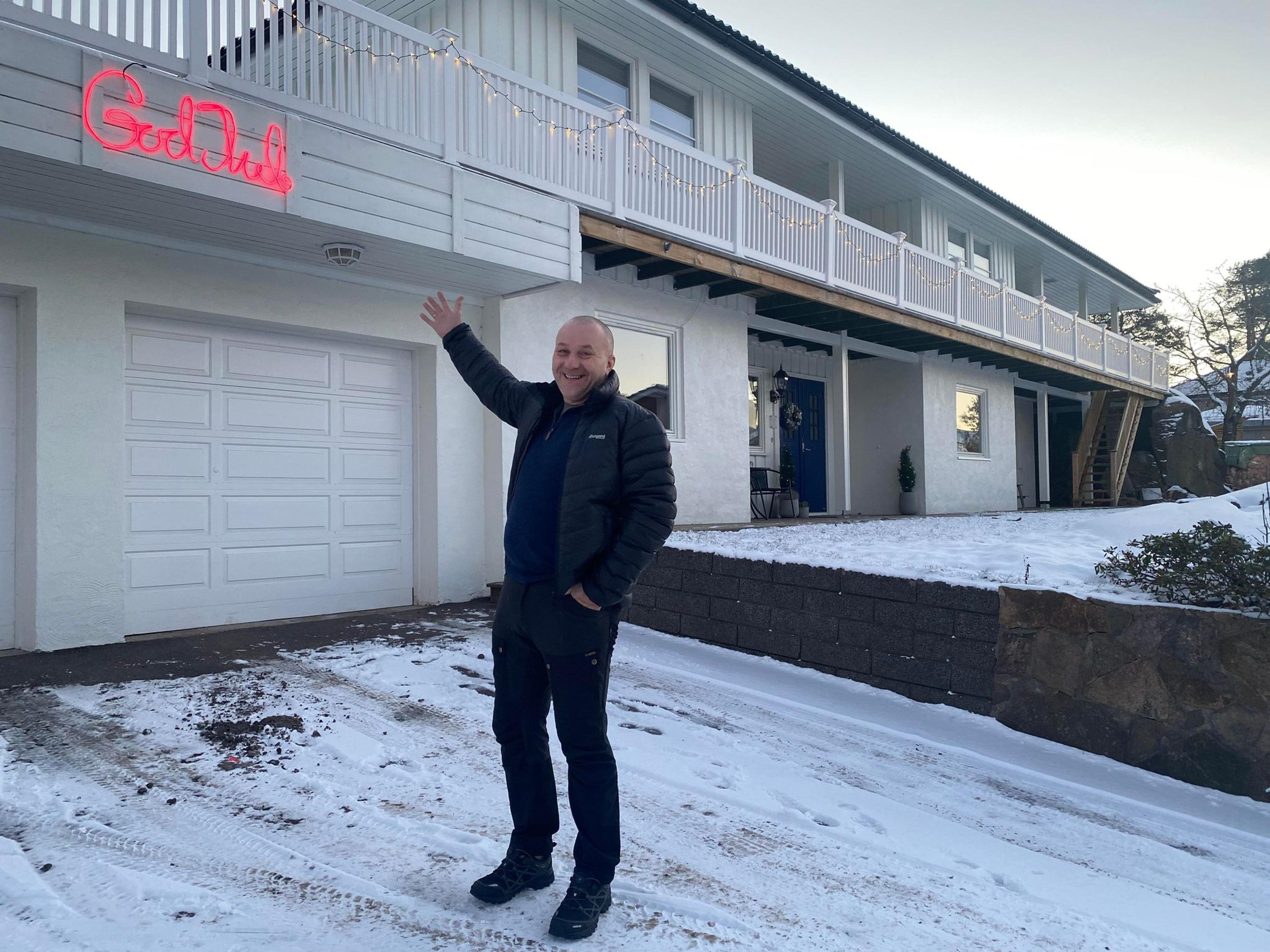 GOD JUL! Hugo Henriksen er nyvalgt leder i Bergsåsen velforening og benytta anledningen til å ønske god jul i velforeningas Facebook-gruppe – og på verandaen over garasjen. Foto: Stian Ormestad.