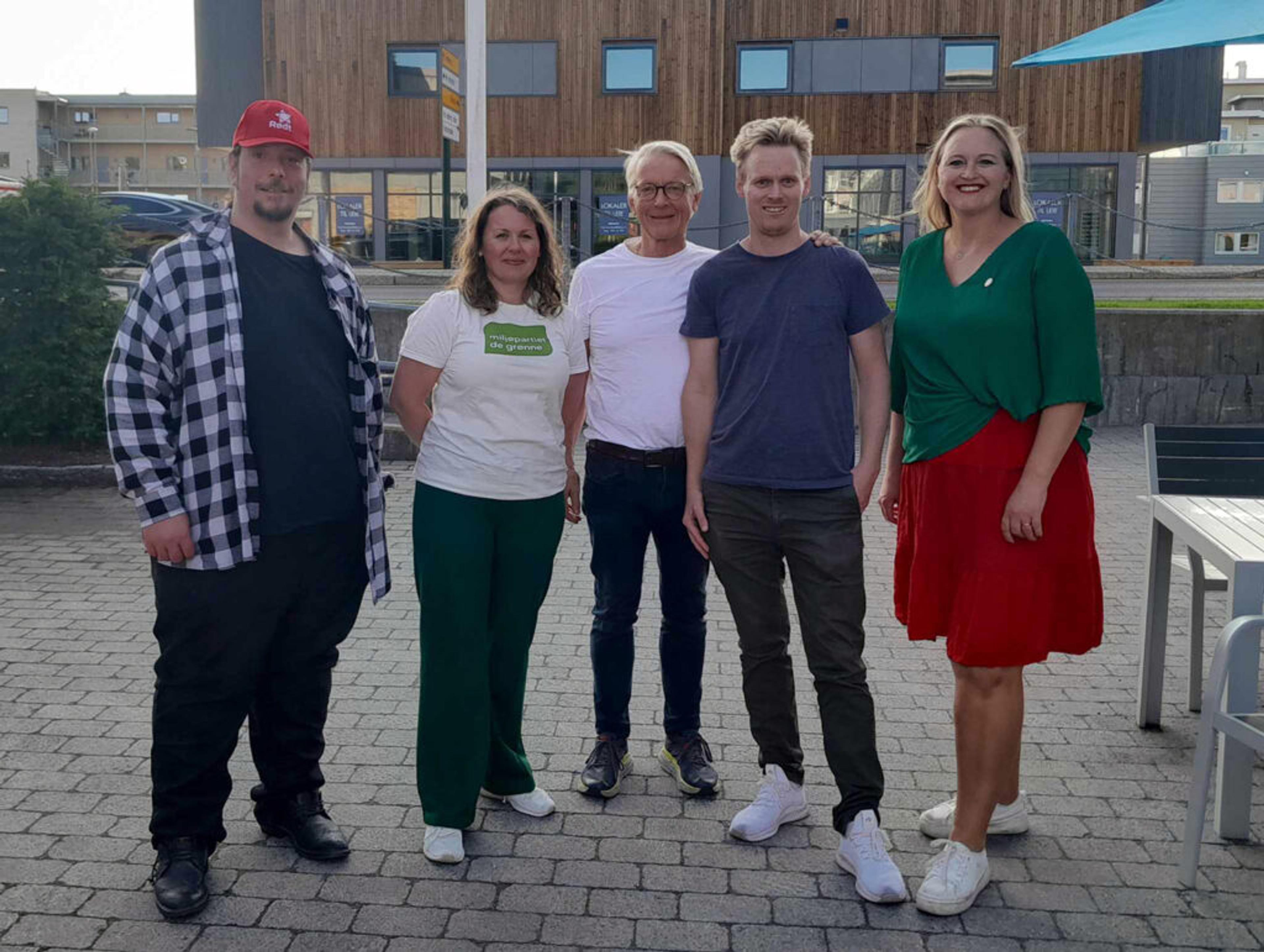 AKSJONERER PÅ REVETAL: Fra venstre Ole Marcus Mærøe, 1. kandidat Rødt), Julie Estdahl Stuestøl, 1. kandidat MDG, Jon Arild Andresen, beboer på Ramberg, Kristoffer C. Eriksen, initiativtaker til Folkeaksjonen, Christina Grefsrud-Halvorsen, 1, kandidat Tønsberg SV. Foto: Privat.