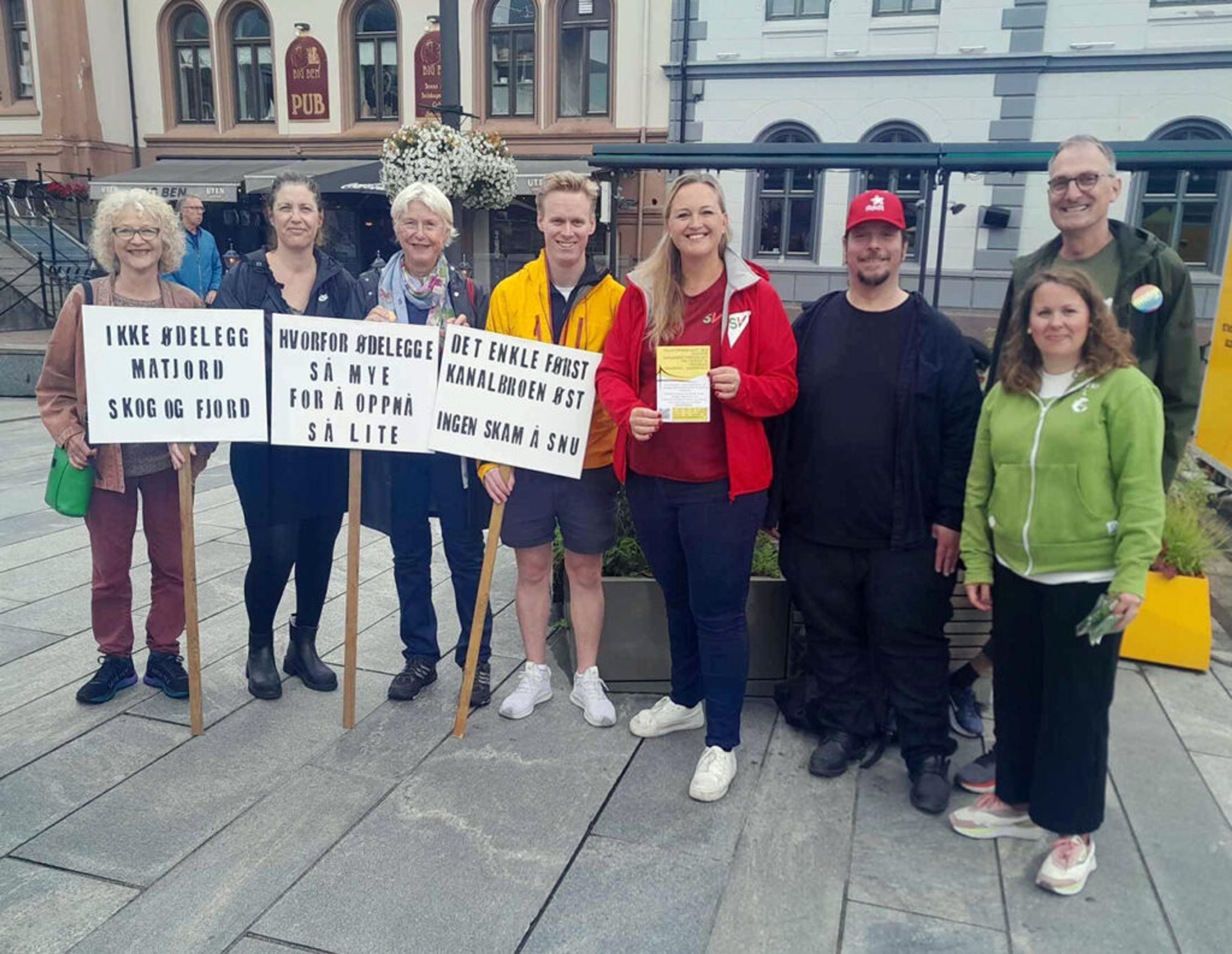 AKSJONERER: «Folkeaksjonen mot fastlandsforbindelsen – den nye» – varsla aksjoner på Revetal og Re-torvet fredag 1. september 2023. Her fra en tidligere aksjon på Tønsberg torg. Foto: Privat.