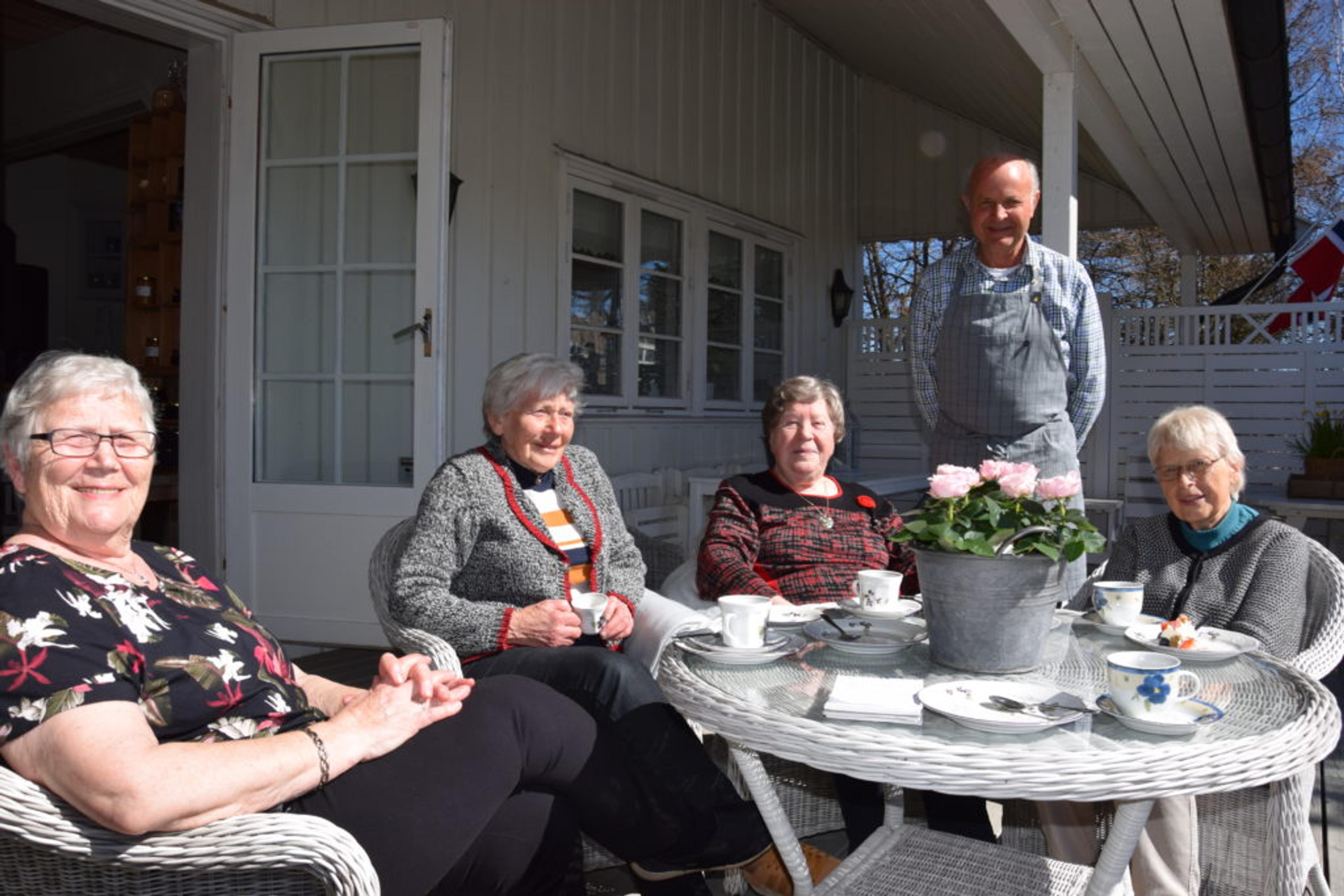 FORNØYDE KUNDER: Fra venstre Liv Turid Bjune, Synnøve Hermansen, Else Marie Andersen og Kari Guthe som blir servert av Tor Vilhelm Bue, Wenches ektemann og viktigste støttespiller, også i landhandelen. Bildet er fra da Vika feira ett år i 2018. Foto: Håkon Westby, ReAvisa.
