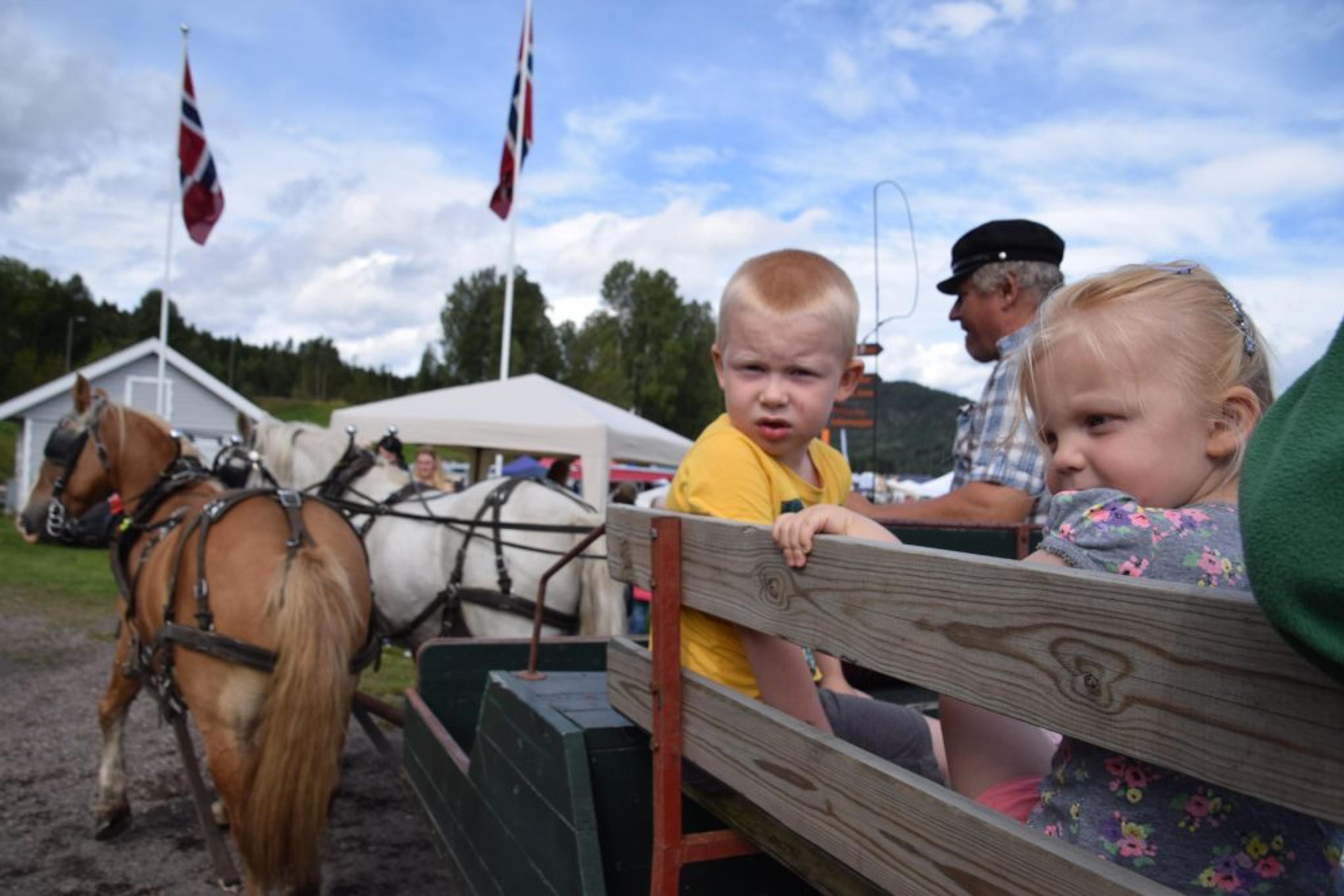 En annen sikker slager er hest og vogn. Malin Sørsdal Lillevik (3) og storebror Lukas Sørsdal Lillevik (5) sitter som tente lys før hesten skal ut på sin neste runde rundt markedsplassen.
