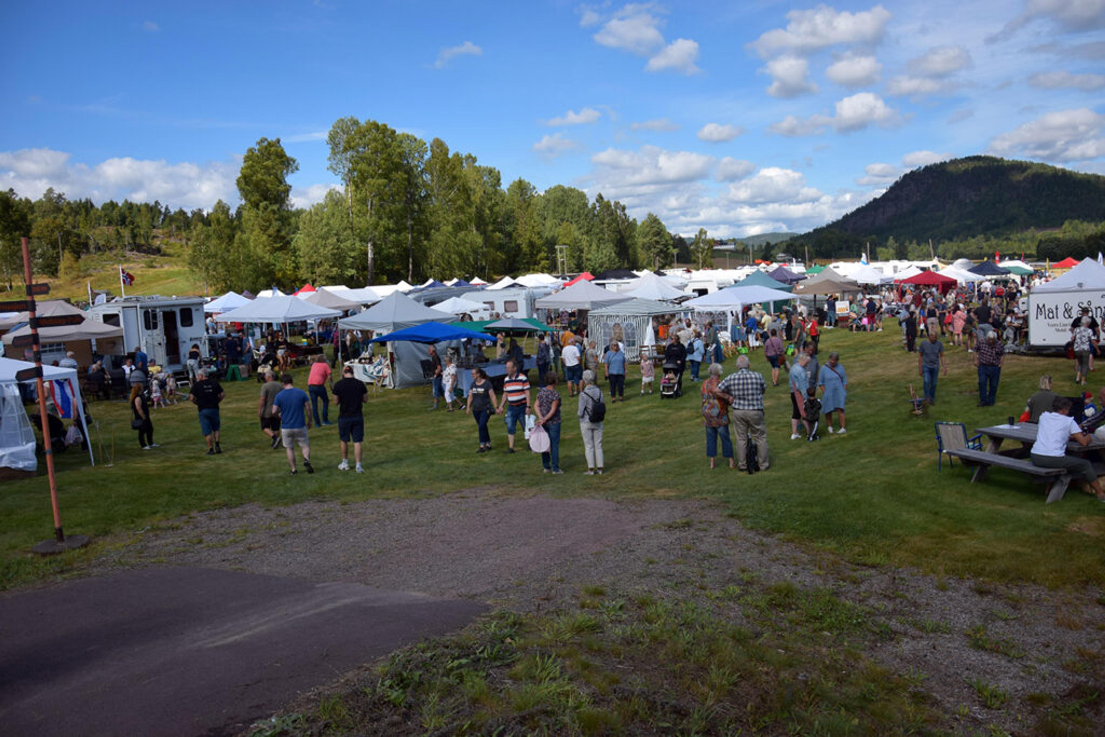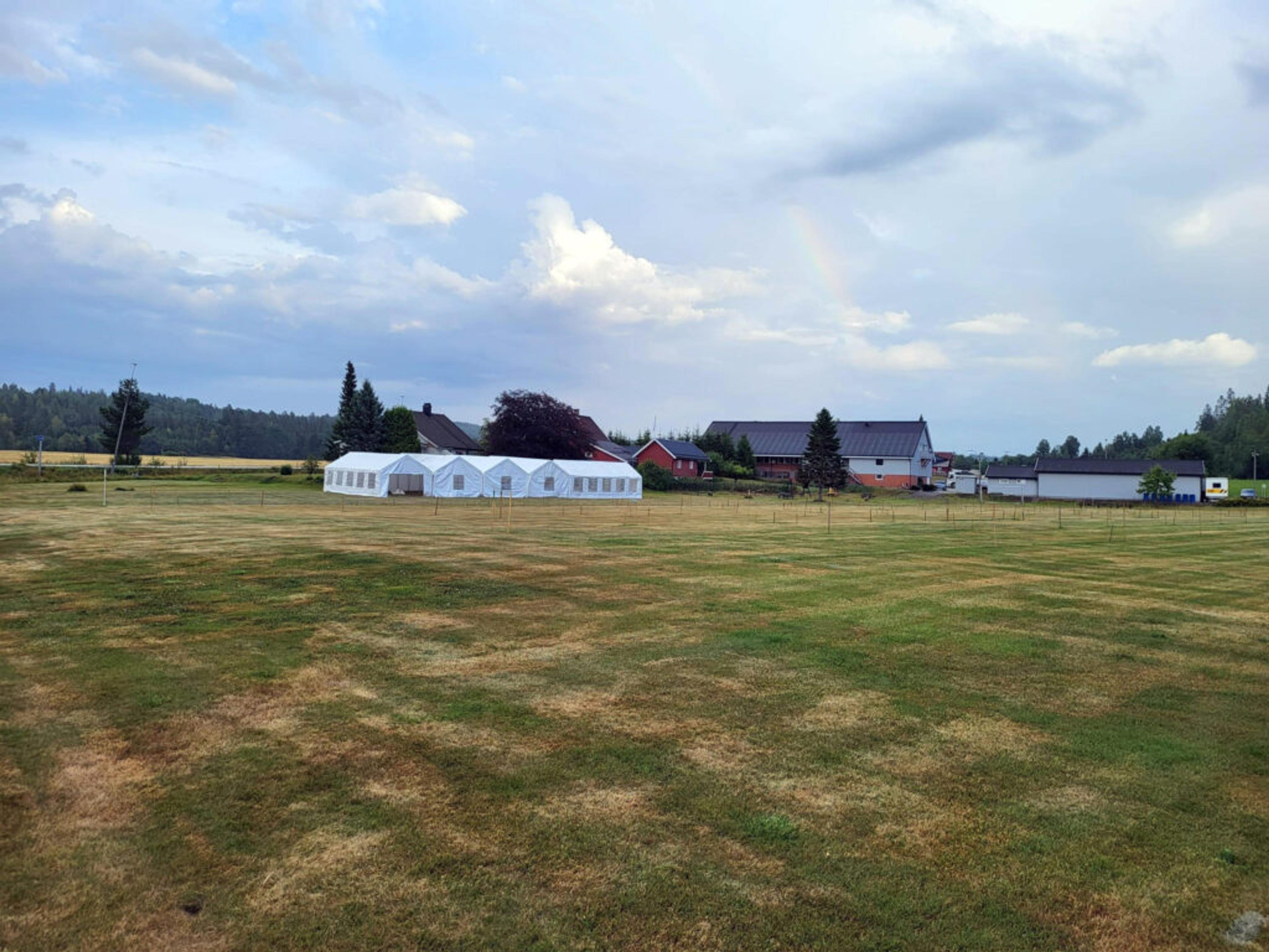 STOR DUGNADSINNSATS: Bygdehuset Sagatun og den store fotballsletta fylles med stands, moro for unga, konserter og kulturinnslag, hele markedshelga lang. I år var markedsdatoen 20. – 21. juli 2022. Her fra opprigg uka før. Foto: Vivestad høstmarked.