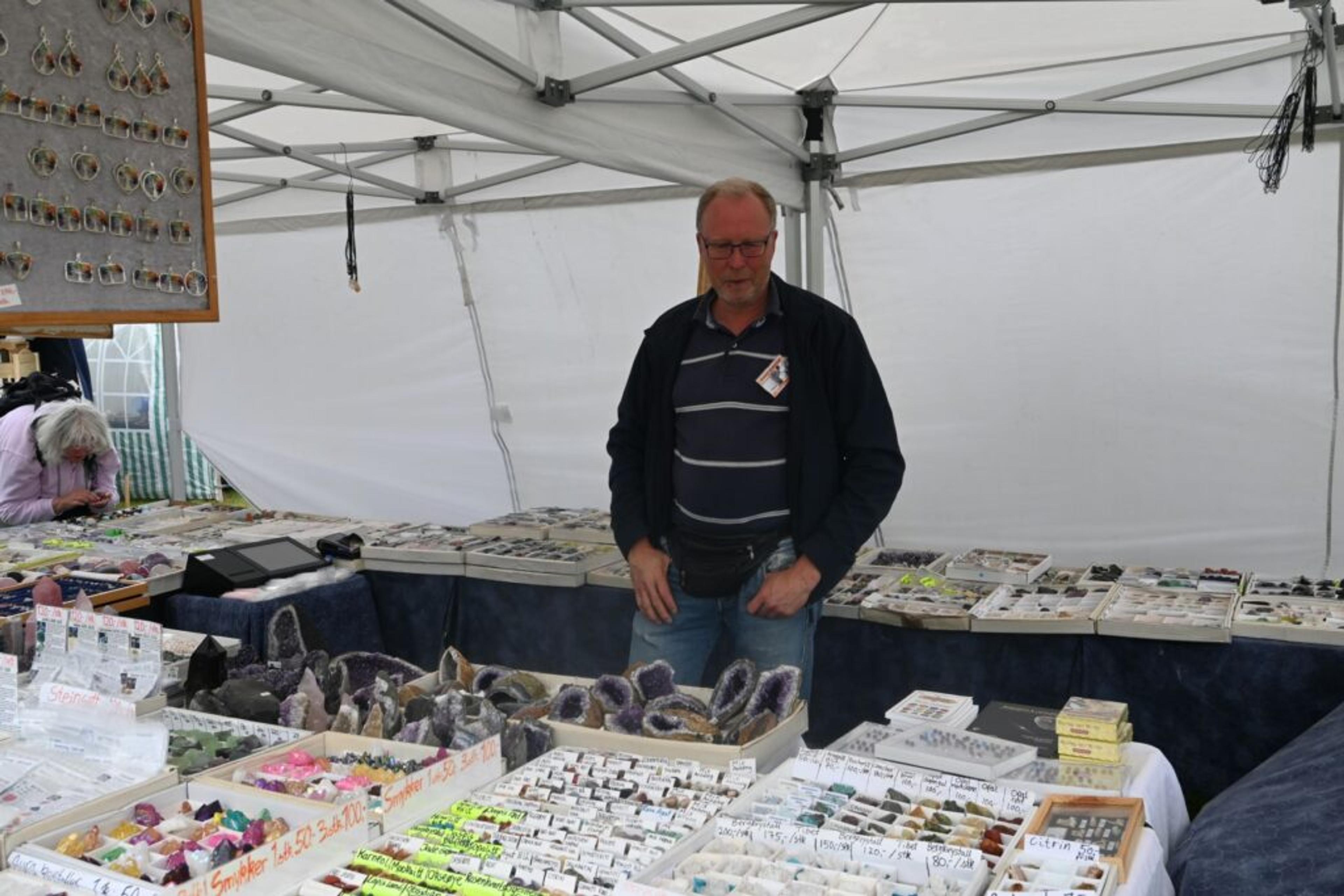 En annen selger på dette store markedet er Freddy Larsen. Han selger mengder med krystaller og steiner av alle arter og egenskaper. De glinser i seinsommersola.