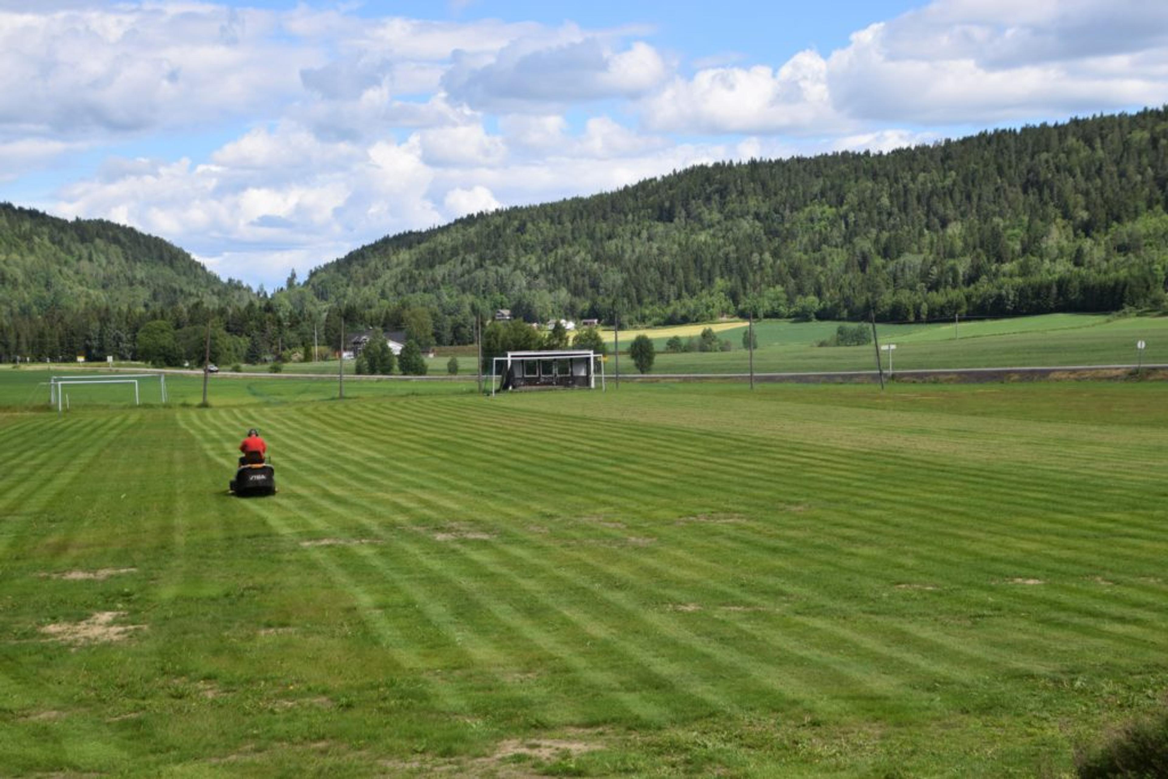 DUGNAD: Ole Berntsen klipper den store fotballsletta som skal huse 150 stands, scene og tusenvis av gjester. Han sitter timesvis på sitteklipperen på dugnad. Foto: Stian Ormestad.