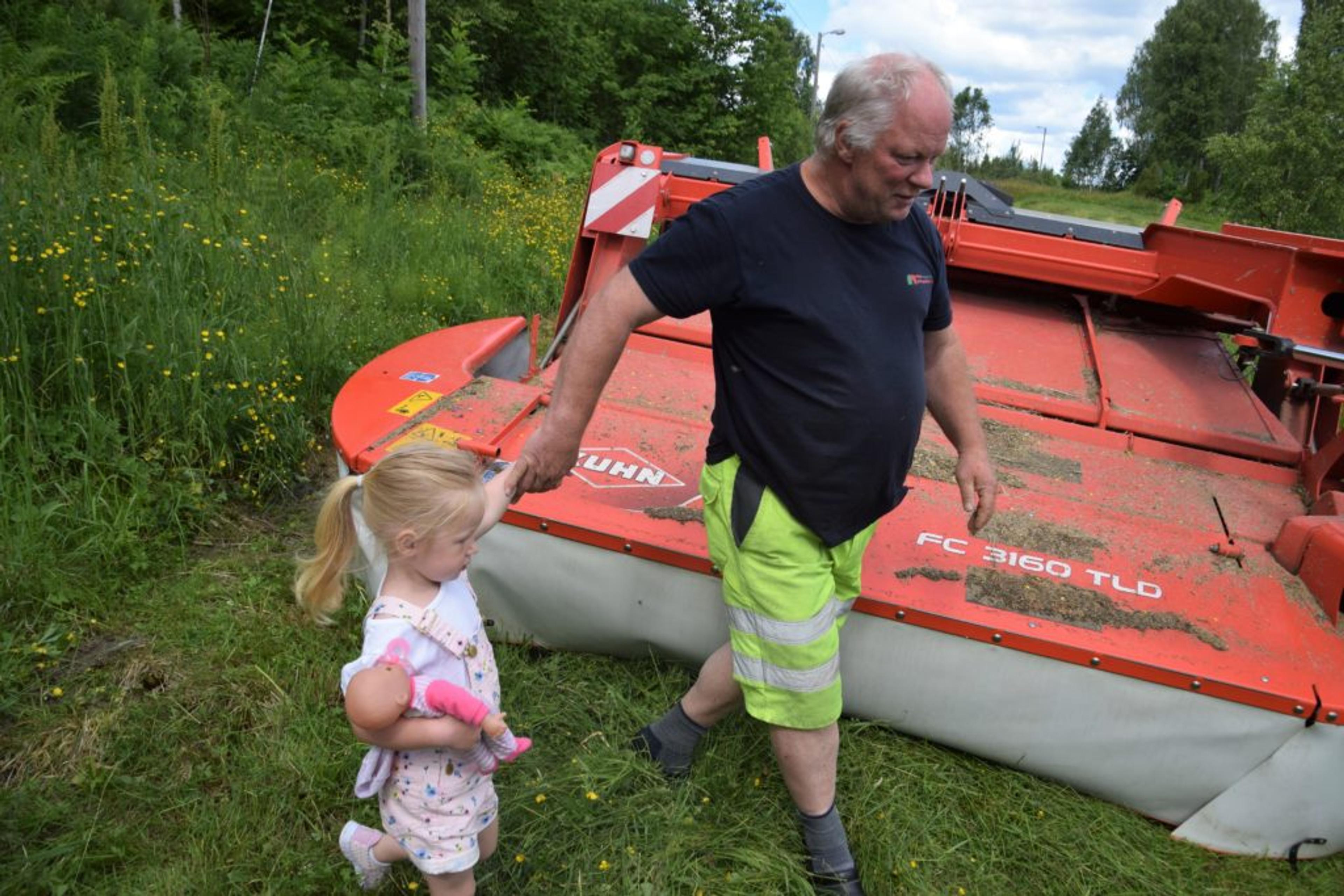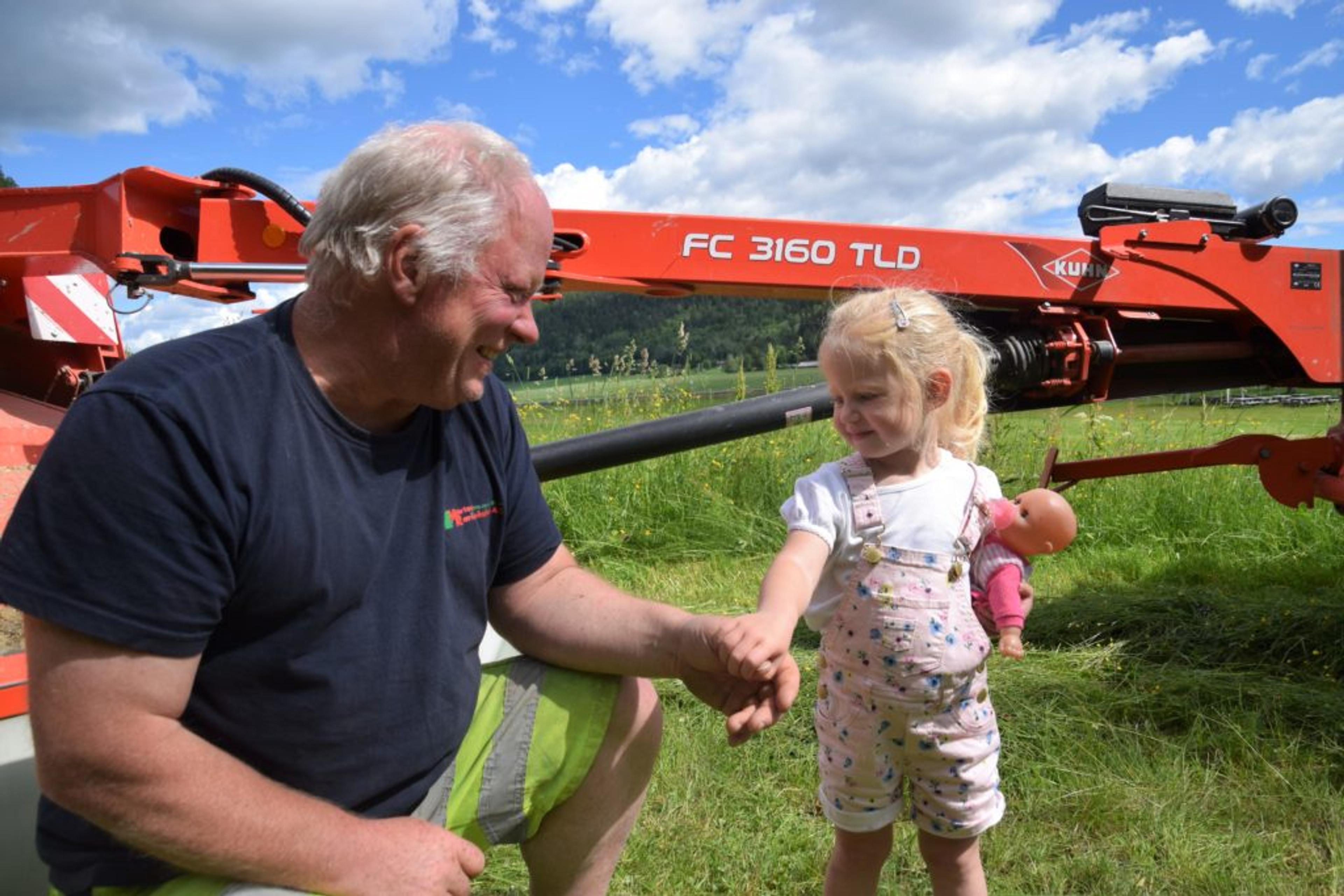 Å kjøre traktor er det aller beste Ellinor Trevland (2) veit. I dag er hun med bestefar Hans Kristian Kjærås (56) på dugnadsjobb: