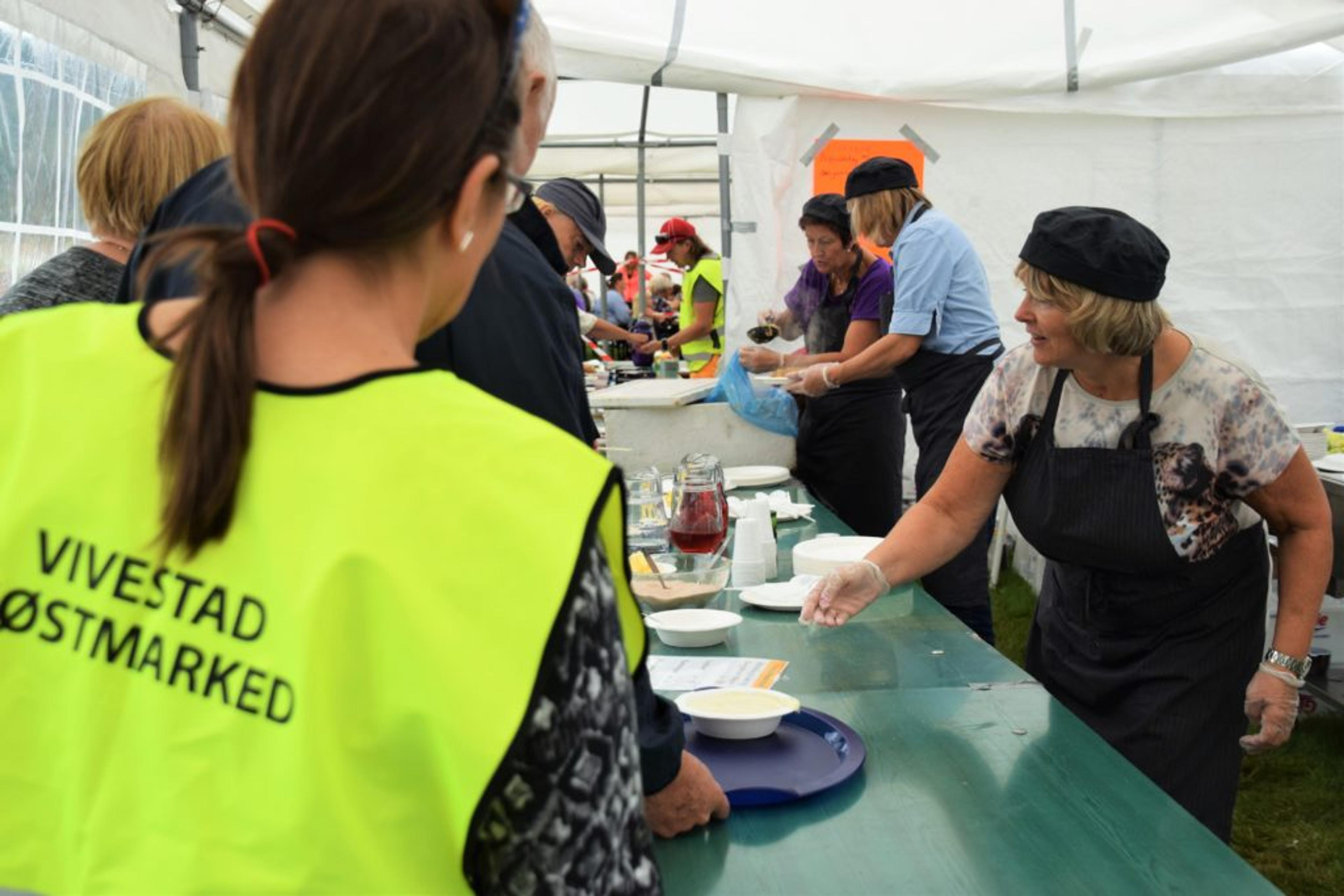 MAT OG DRIKKE: Vivestad Høstmarked veit at god mat og drikke er viktig – derfor jobber hele 60 dugnadsfolk bare med mat i løpet av helga. Det går nærmere 1.000 liter lapskaus i løpet av helga. Foto: Stian Ormestad.
