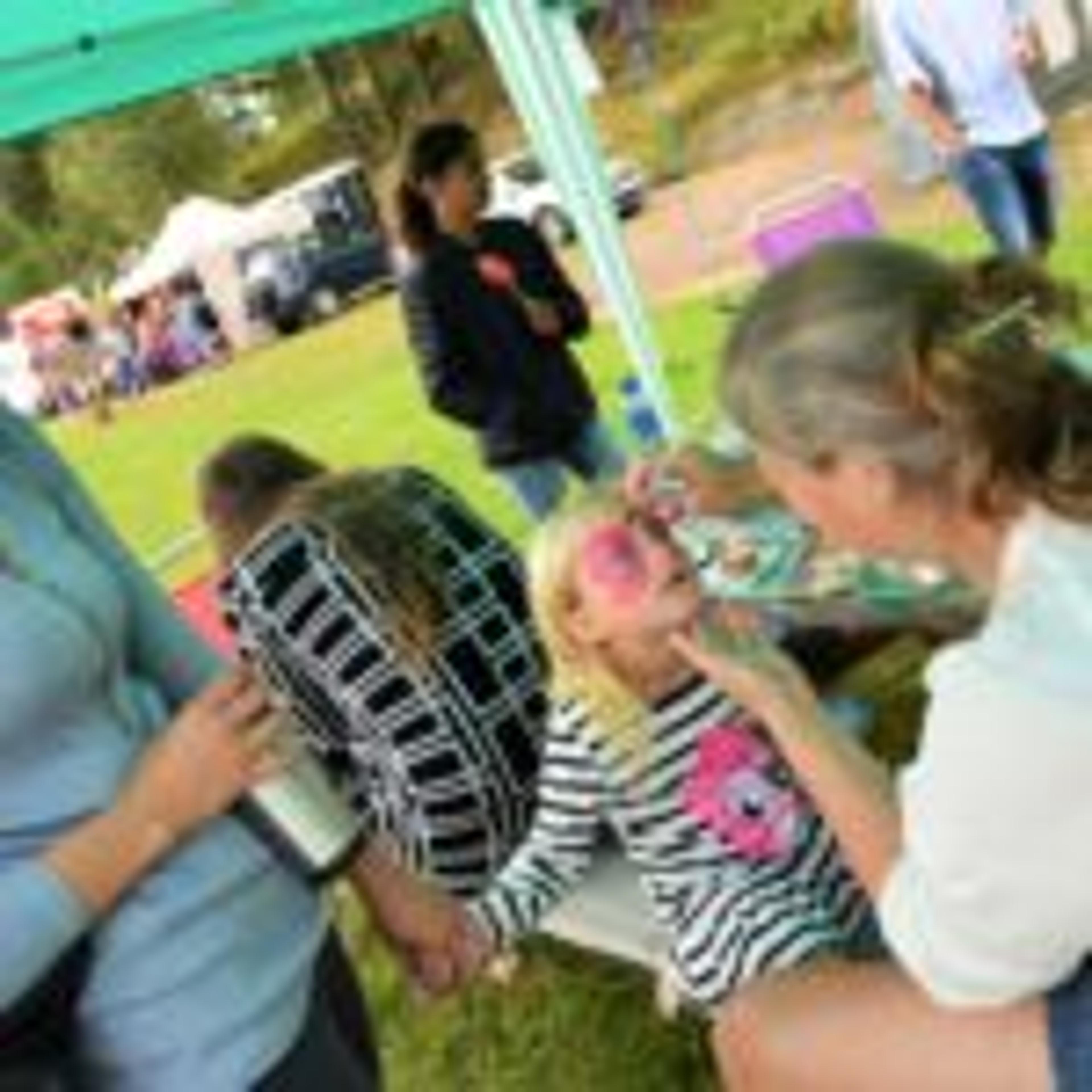 ANSIKTSMALING: Malin skjærstad Kjellås (5 1/2) fra Holmestrand blir her til en flott sommerfugl under fjorårets marked. Karin Siebenlist fra Vivestad er kunstneren bak et av mange, mange kunstverk i løpet av markedshelga. Foto: Stian Ormestad.