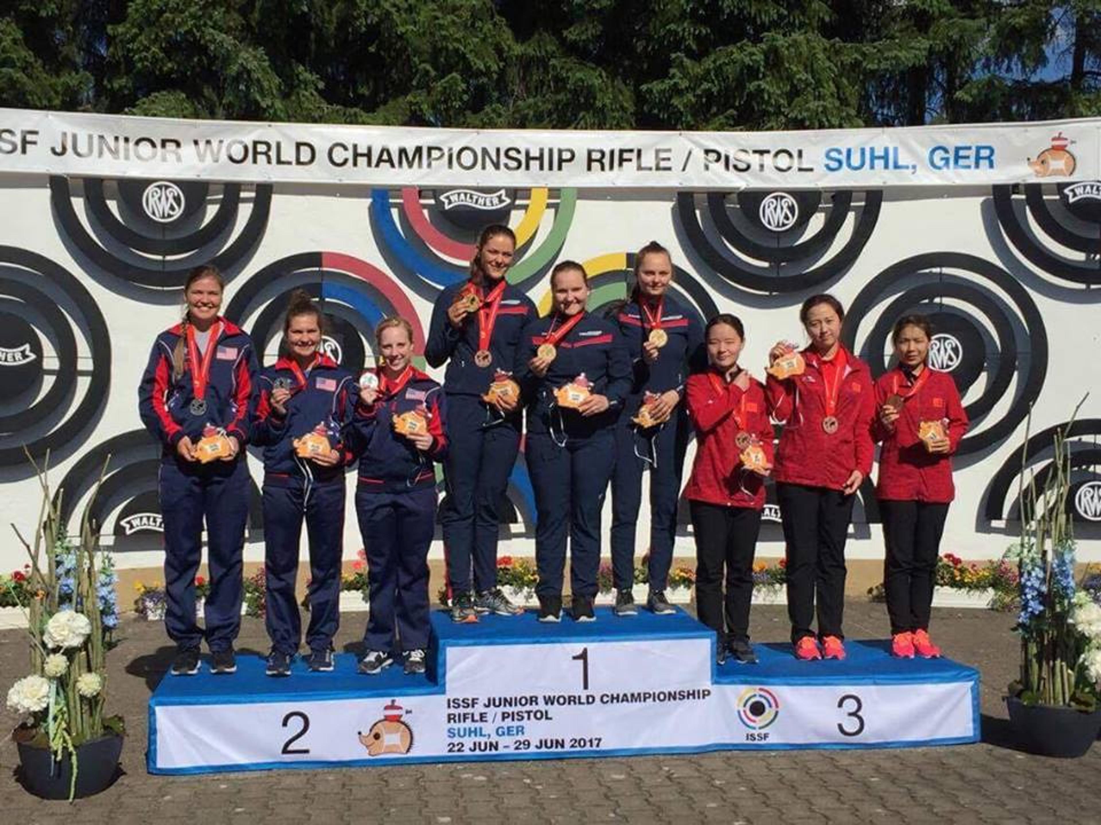 LAGGULL: Jeanette Hegg Duestad (18) fra Fon står her på toppen av pallen sammen med lagvenninnene fra Norge. De satte også en ny verdensrekord. Foto: Privat.