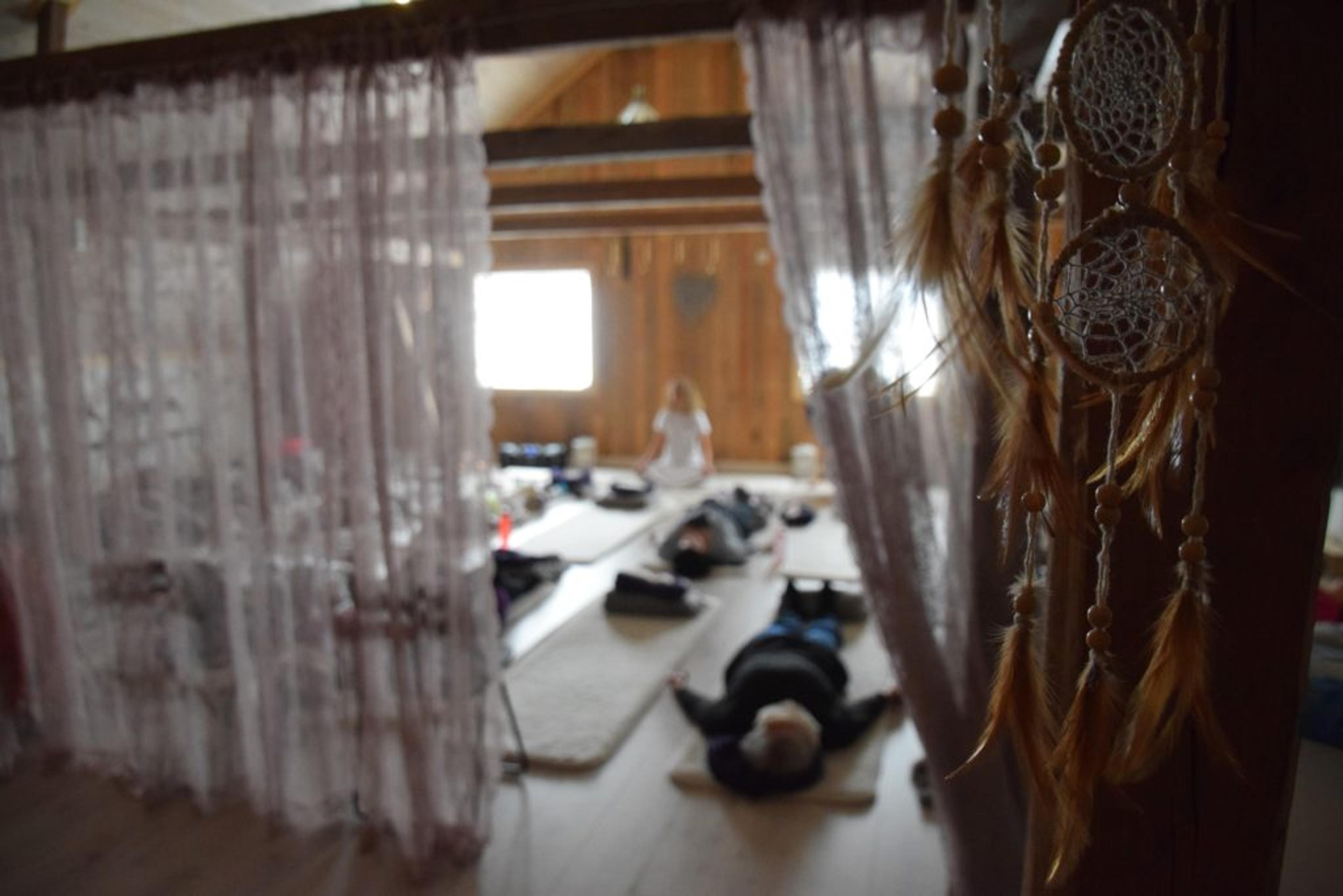 FLOTTE RAMMER: Her puster et formiddagskurs ut hos Main i yoga-låven. Foto: Stian Ormestad.